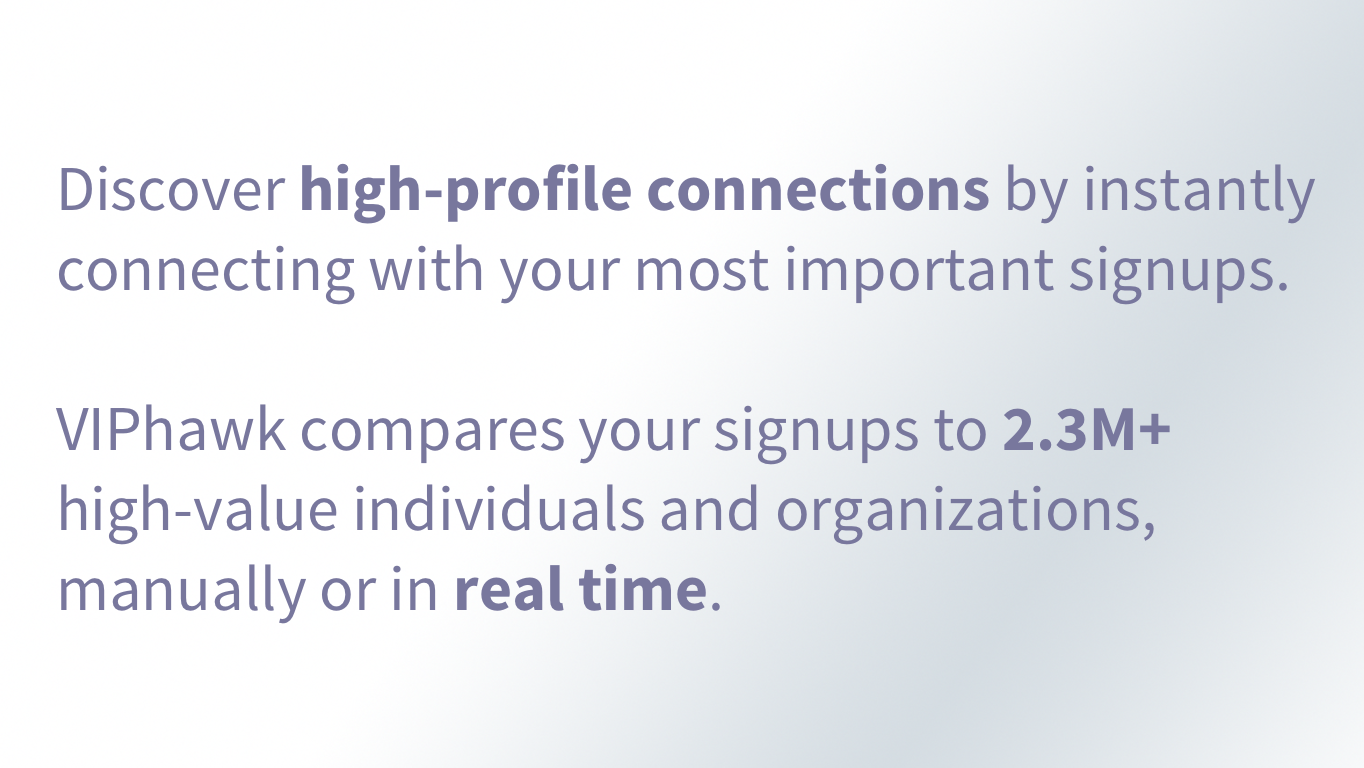 VIPhawk is simple - it watches your signups and detects when there's interest from VIPs like journalists, celebrities, investors, or anyone you think is important. Then, it flags that signup and optionally notifies you via email or text message. Wondering how we detect VIPs? We’ve built a proprietary database of high-value individuals and organizations, that even includes personal email addresses of important A-list prospects. For most VIPs, VIPhawk also offers detailed background information like social networks, photos, websites, and more. Over 2.3M VIPs are being tracked by the database across over a dozen categories, so you'll never miss out on an important signup. You can integrate VIPhawk's real-time notifications by including one line of javascript on your site, or build a custom integration using VIPhawk's API. You can also check signups for VIPs manually by uploading a CSV of signups.