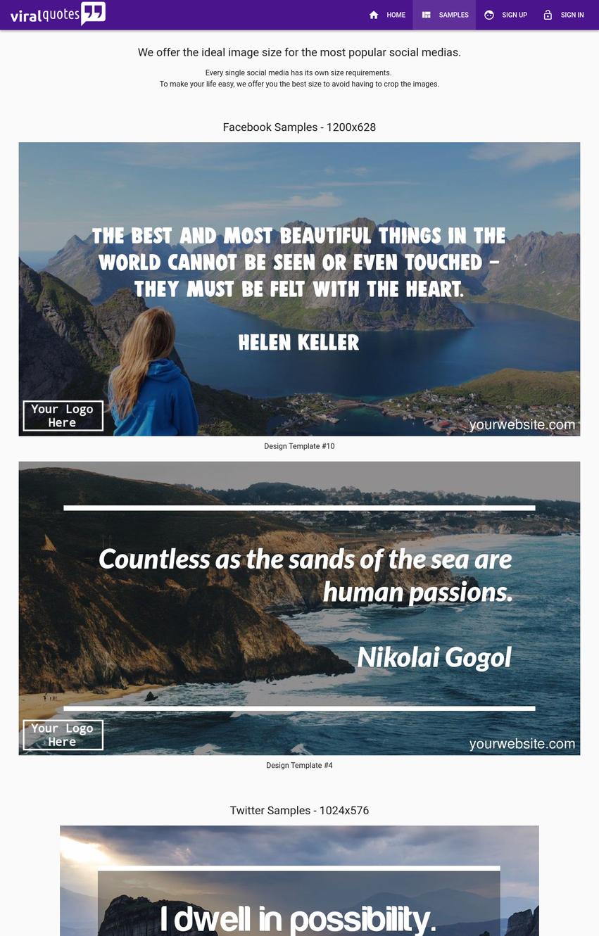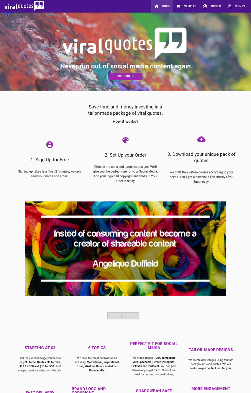 Viral Quotes is the ultimate social media content generator. Choose from a wide range of topics and enjoy an original set of custom quotes, with backgrounds chosen from our quality set of royalty-free images. Boost your online presence and never run out of content again!