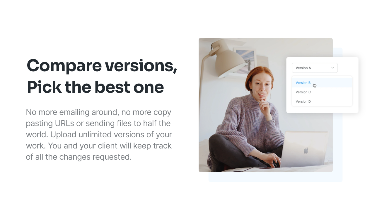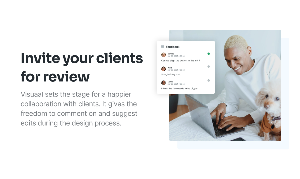 Getting feedback from clients is one of the most time consuming tasks for designers. Exchanging lots of mails and versions takes a long time. Sending files back and forth is time consuming and it's hard for clients to keep track of all the changes they requested. Visuaal sets the stage for a happier collaboration with clients. It gives the freedom to comment on and suggest edits during the design process. Visuaal is the designer friendly tool for collecting client feedback and keeping track of all versions. Clients can easily browse through all files, give comments and feedback, view changes and create links between the designs and the comments they've created.