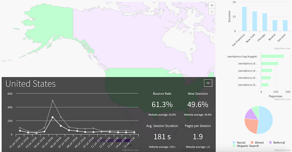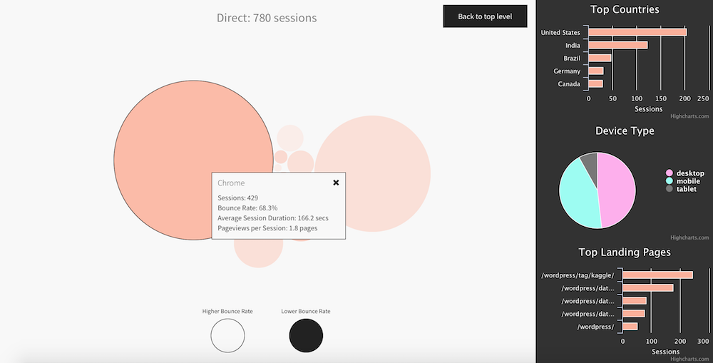 Visual Analytics is a free application that allows you to view your Google Analytics data using a range of intuitive and interactive visualizations. These visualizations help you to really understand where your users are coming from, how they are getting to your website, and what they are doing when they get there. Intended as a supplement to your existing Google Analytics dashboard, Visual Analytics aims to make your data more intuitive, interesting, and accessible.