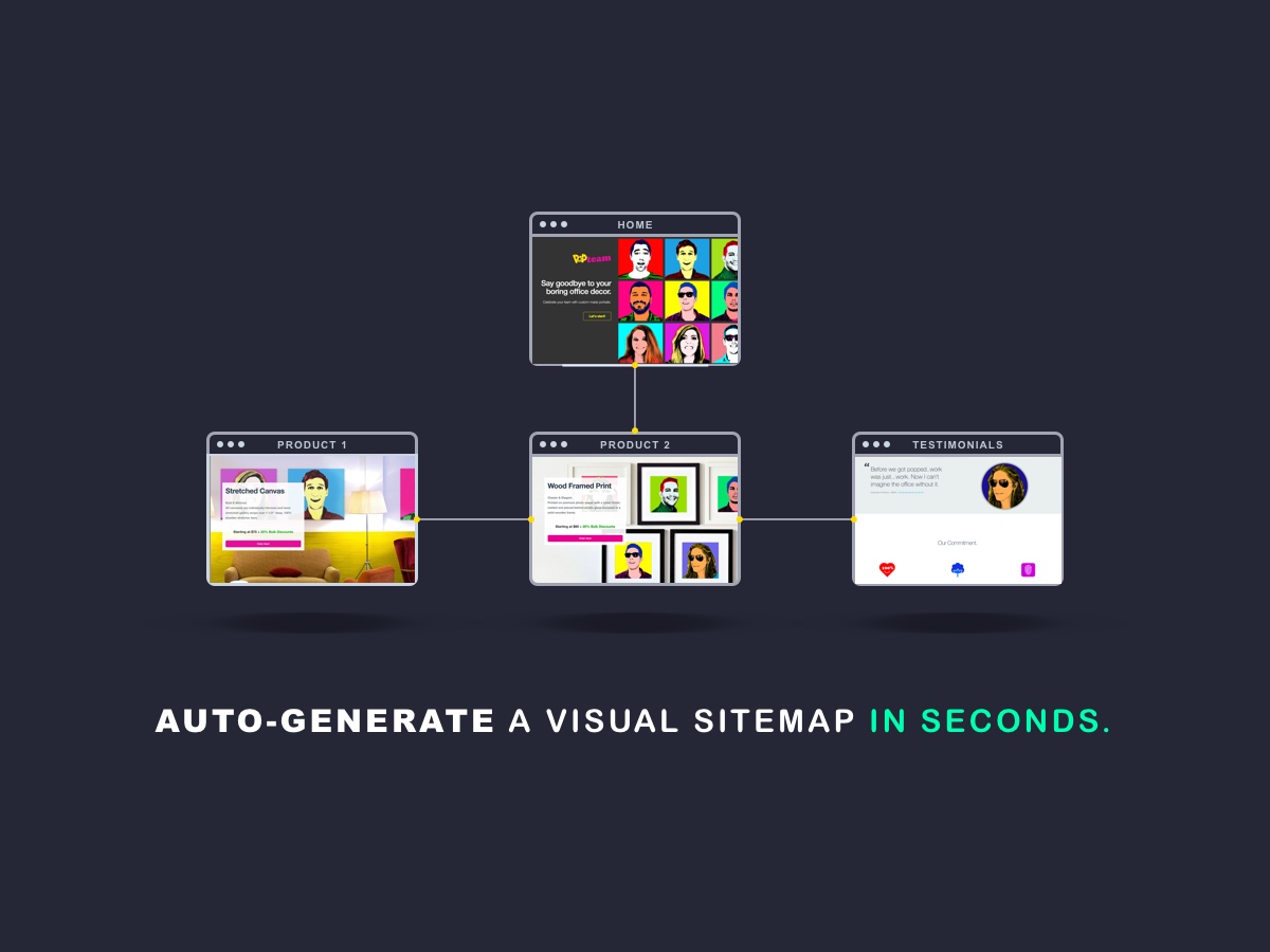 VisualSitemaps automatically generates high-quality visual sitemaps + high-res screenshots of any site or app, making it fast and easy to perform in-depth site audits for SEO, UX and marketing research. signup here to join our beta list: https://VisualSitemaps.com