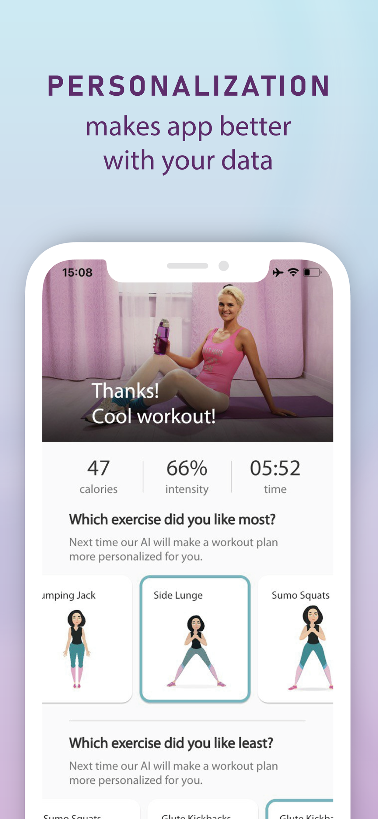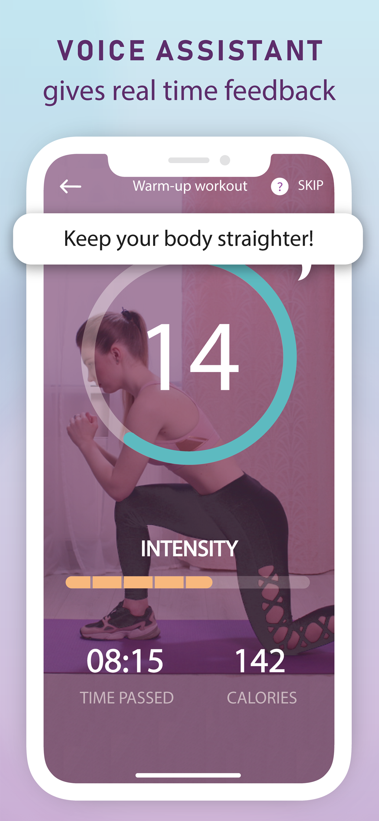 a fitness app based on AI-technologies which replaces workouts with a personal trainer. The camera analyzes all the movements during the exercises and adjust them if necessary. After several training sessions, the algorithm processes all the collected data and creates an individual workout plan depending on the goals. First, the user selects the type of workout and installs the phone into the right position. During the workout AI: - analyzes movements and techniques; - warns if the user is doing something wrong; - counts reps; - tells when to finish or go to the next exercise.