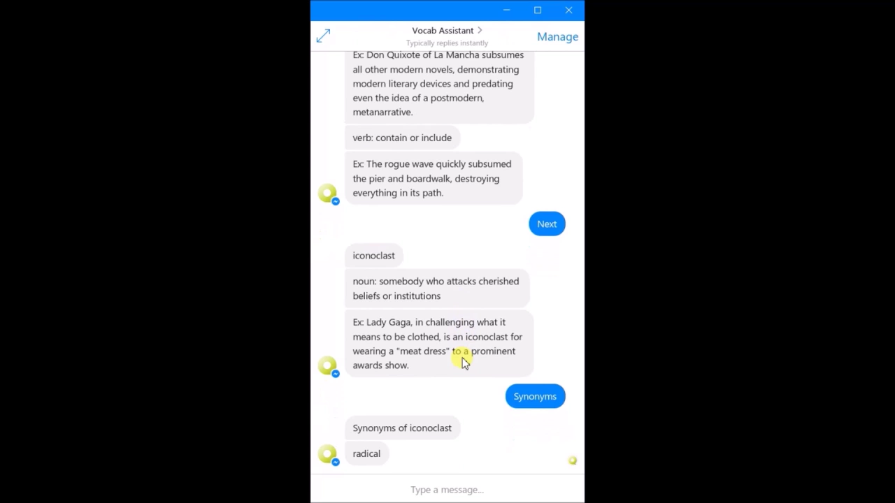 Vocab Assistant (http://www.vocabassistant.com/) is a conversational bot (yes, it talks to you via chat) which teaches you new English words based on your requirements and keeps track of your progress. It can teach new words (based on levels), help you revise old words that you have already learnt, show examples/synonyms/antonyms if you ask for, help you bookmark difficult words, etc. So, It is designed in such a way that people feel the comfort of learning from a real teacher.