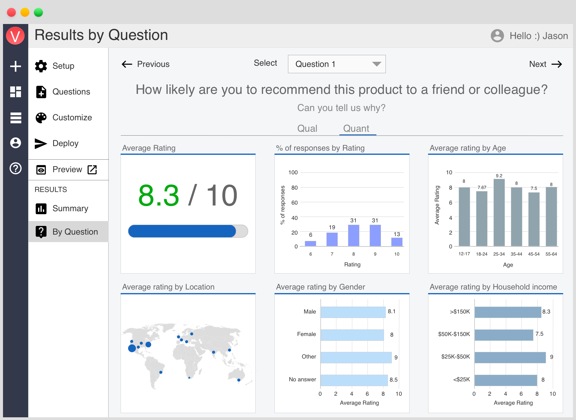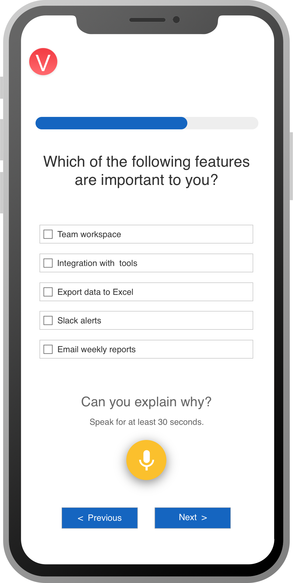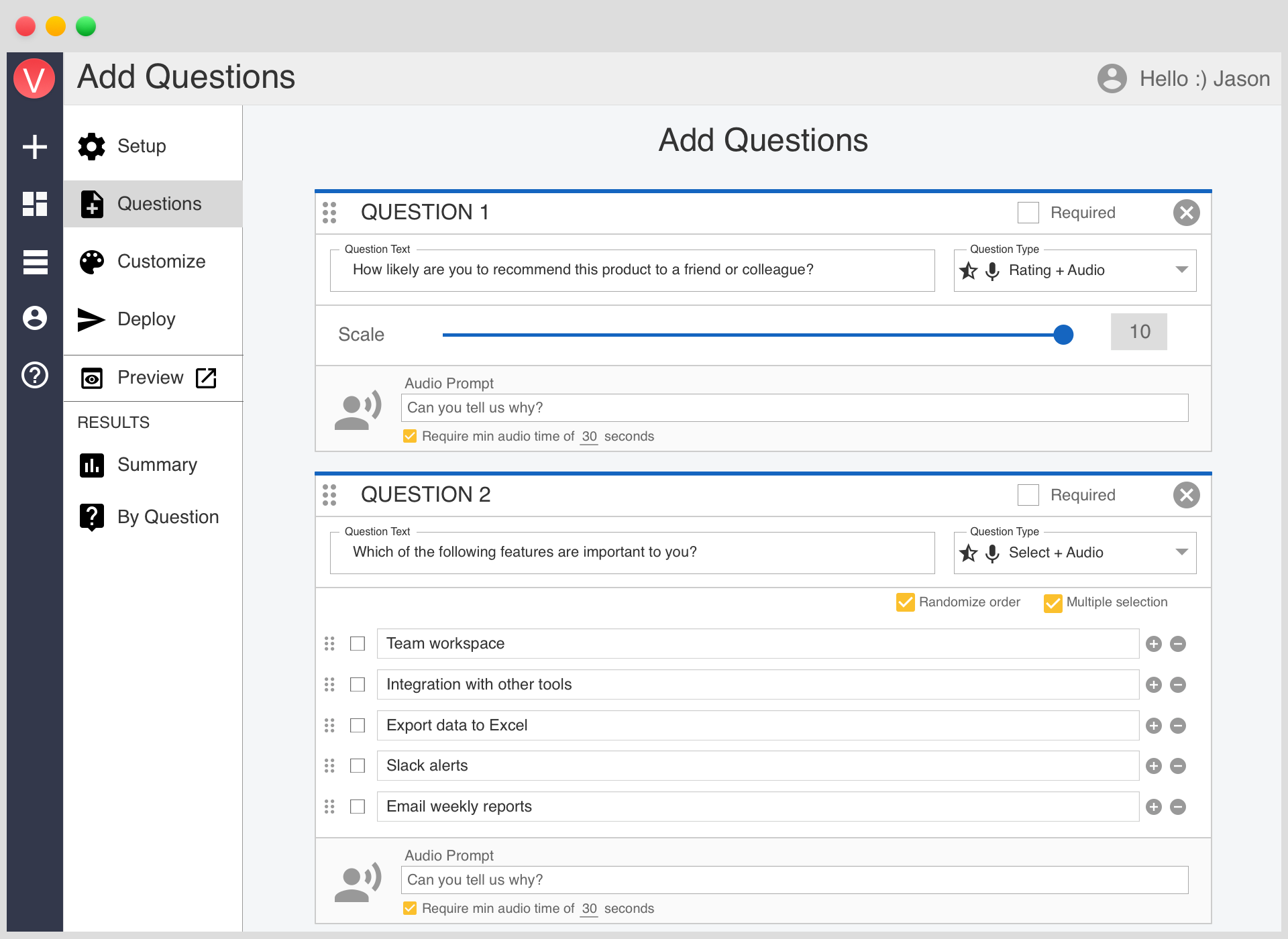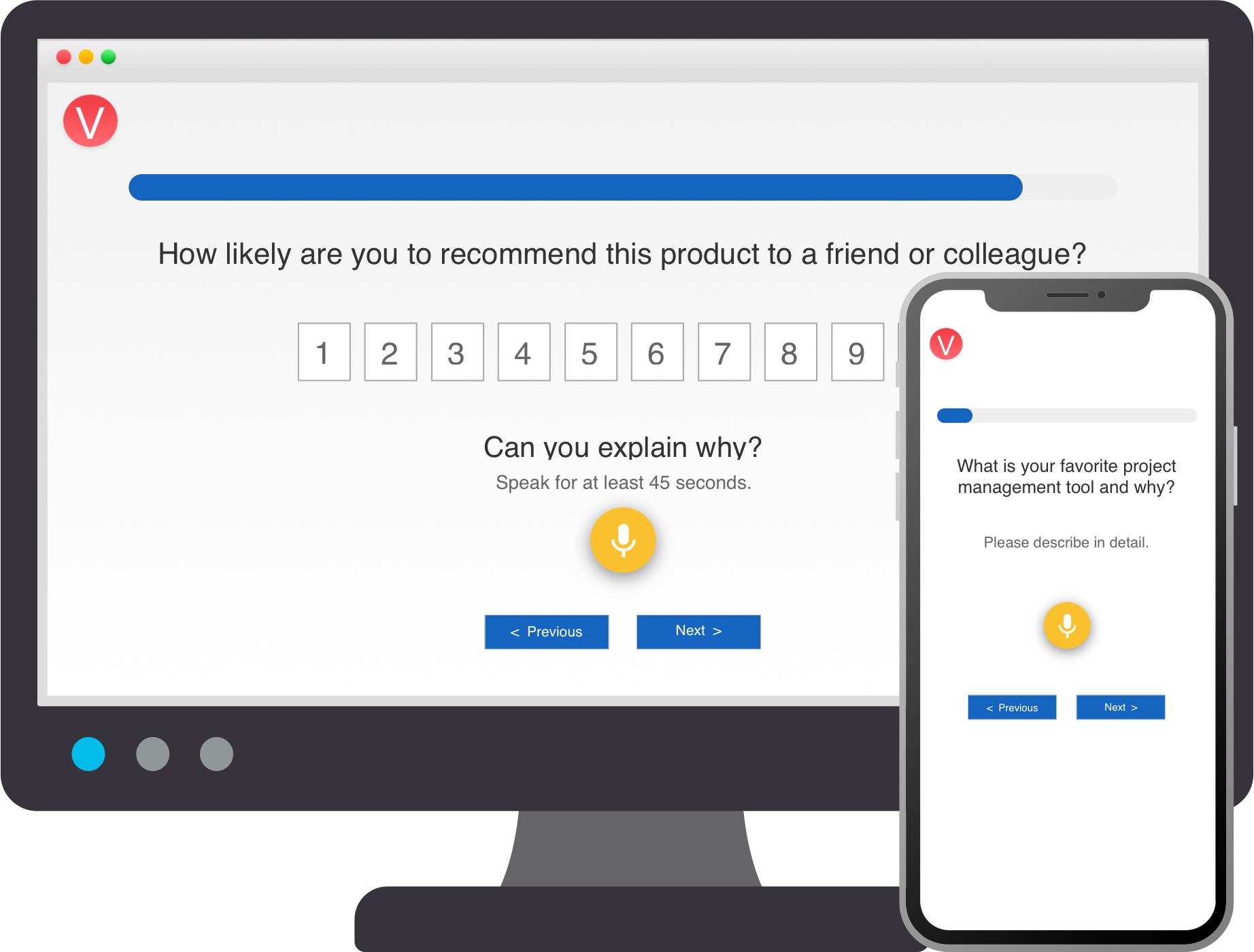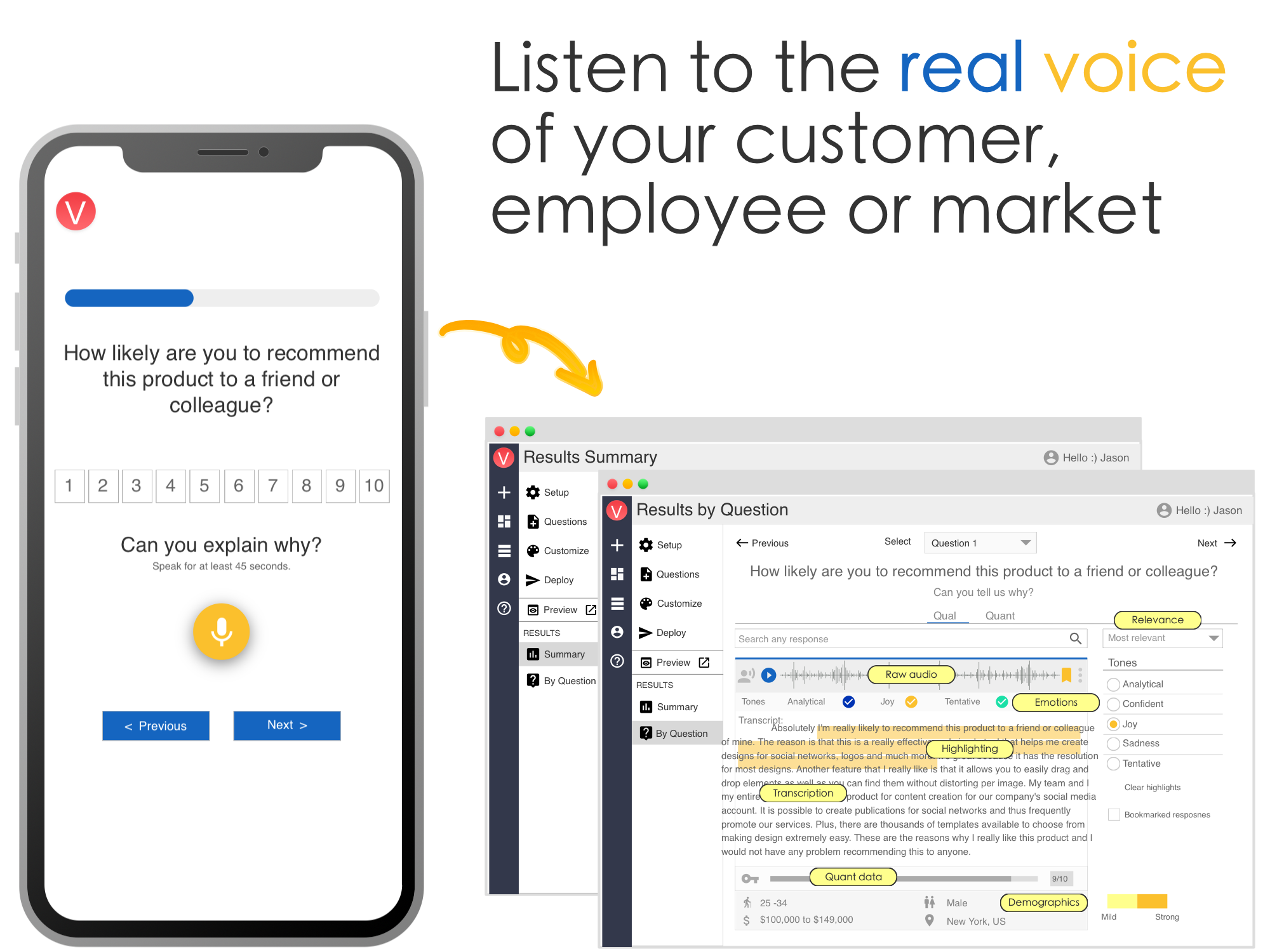 Vocally.us helps Product, Research and Voice of Customer professionals gather voice- powered insights from their users, employees and their market. Traditional surveys only tell you the "what", not the "why". That's because they depend on pre-determined answer choices and users hate typing on open-text response boxes. Vocally.us solves this problem by combining quant + qual into a single integrated experience. Users point and click to provide quant data and record their voice to provide deep qualitative. Using Vocally.us, you can understand both the "what" and the "why" for any question that matters to your business for the first time. So, stop guessing! Use Vocally.us Free for 21-days!