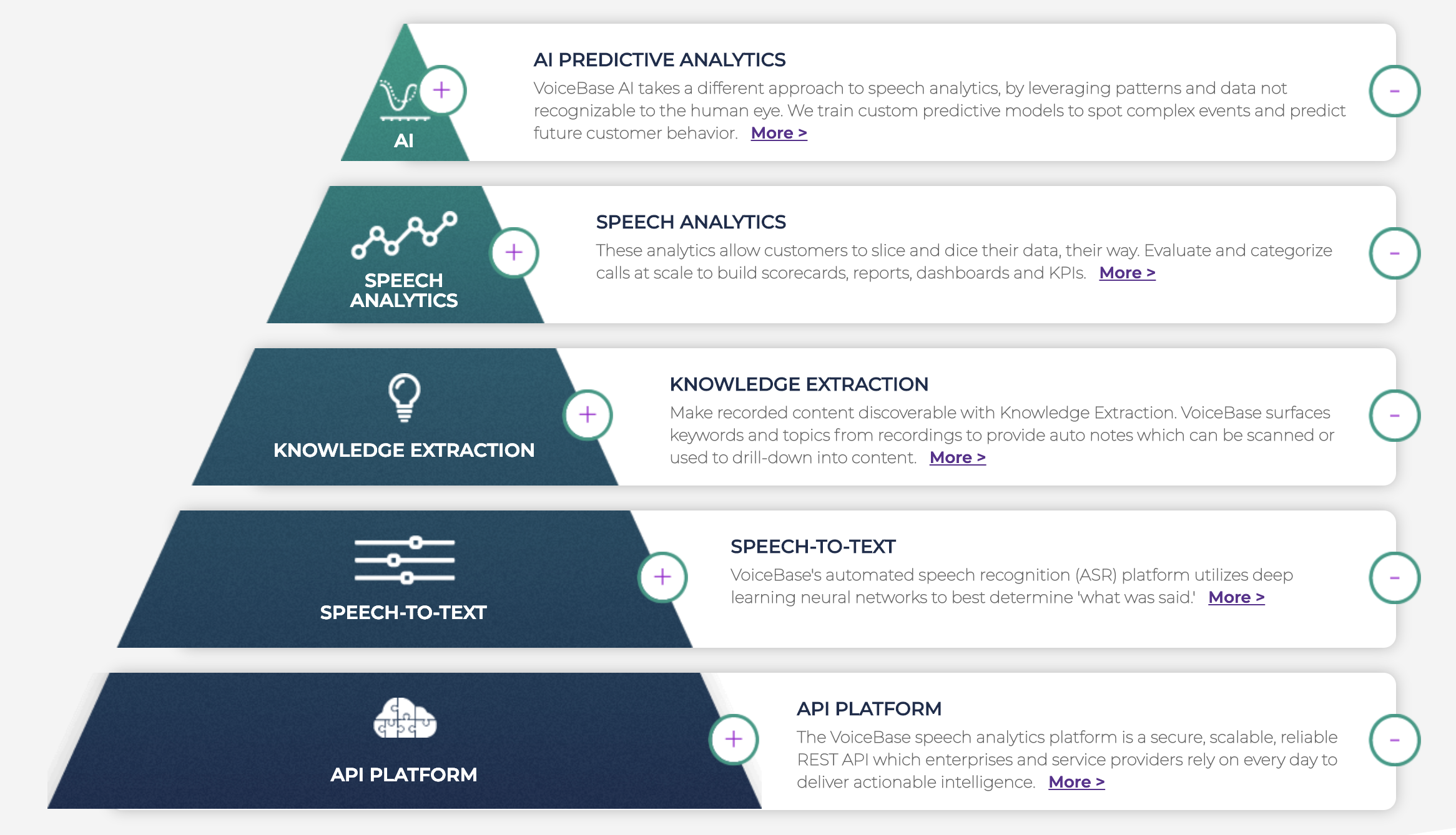 VoiceBase AI takes a different approach to speech analytics, by leveraging patterns and data not recognizable to the human eye. We train custom predictive models to spot complex events and predict future customer behavior. Our Speech Analytics allow our customers to slice and dice their data, their way. Evaluate and categorize calls at scale to build scorecards, reports, dashboards and KPIs. VoiceBase automatically extracts keywords and generates overall topics from audio and video recordings to provide automatic notes which can be scanned, or used to drill-down into content. VoiceBase data can be easily used in any BI tool, such as Tableau. Our open API allows complete customization of call center data to gain insights on customer experience and business intelligence.