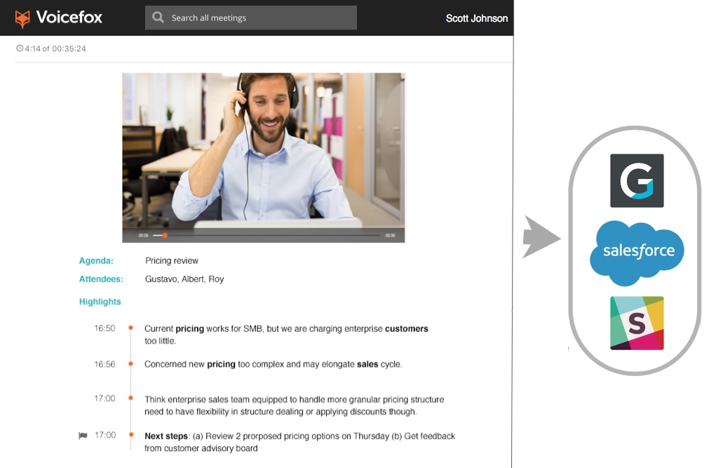 Voicefox is an AI-driven online meeting assistant that helps you run more productive and actionable meetings. Voicefox integrates with existing video conference solutions to record, transcribe and analyze business conversations. Smart Recorder - records the meeting and lets users review it later by searching for keywords, listening only to when the customer is speaking or jumping to the point in the conversation where a slide or screen was presented. You’ll also be able to search across multiple meetings by keywords, as well as get a transcription of every meeting. Real-time Notetaker - during the meeting, you could type your notes in Voicefox. One of the benefits is you can use hotkeys to insert transcription of what was said, an image of what was presented, a list of attendees and other annotations. Essentially our goal is to let users type notes in half the keystrokes.