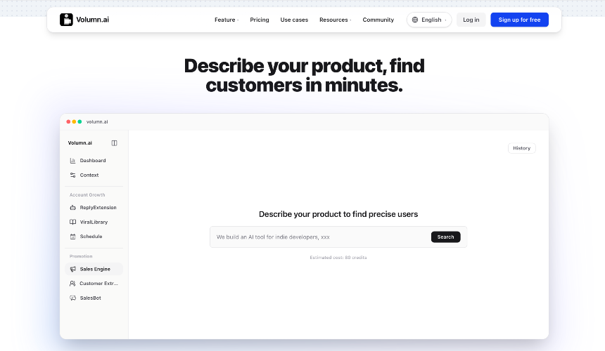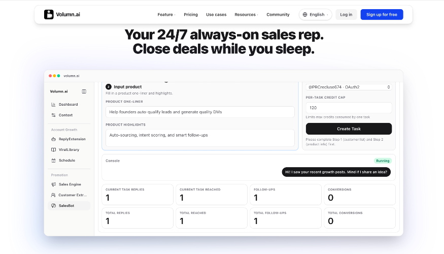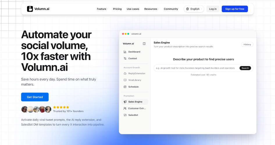 Automate your social volume,10x faster with Volumn.ai. Save hours every day. Spend time on what truly matters. Activate daily viral tweet prompts, the AI reply extension, and SalesBot DM templates to turn every X interaction into pipeline. Features: all-in-one growth engine with traceable revenue Volumn.ai fuses proprietary data, a 24/7 SalesBot closer, and instant prospect search so founders can acquire on autopilot with full attribution. Million-profile data cloud Access a curated buyer graph of 1M+ X accounts with intent tags, roles, and contact context ready for campaigns. 24/7 SalesBot closer Let SalesBot qualify, reply, and follow up in every timezone, logging each DM like a tireless SDR that never sleeps. One-line SearchEngine Describe your ideal buyer in one sentence and SearchEngine surfaces live conversations, replies, and follow targets instantly. Compliant automation Every automation aligns with Twitter policies, giving you an auditable trail for security and finance teams.