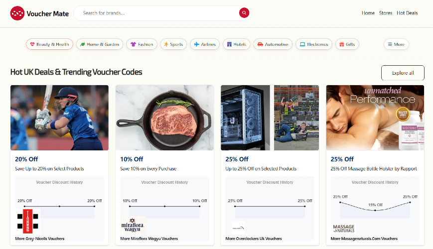 Voucher Mate is a comprehensive web-based platform dedicated to helping UK consumers save money on their online shopping. Operating as a centralized deal aggregator and savings engine, our service provides users with free, instant access to thousands of verified discount codes, promotional offers, and exclusive vouchers. Key features of the platform include a highly searchable, real-time database of active coupons, intuitive categorization (spanning fashion, electronics, travel, home & garden, and more), and dedicated brand pages for top UK retailers. The platform is designed for seamless user experience, allowing shoppers to easily copy codes and apply them directly at checkout. By continuously updating and verifying our promotional data, Voucher Mate serves as a reliable daily shopping companion that maximizes purchasing power while helping online retailers drive targeted traffic and increase sales conversions.