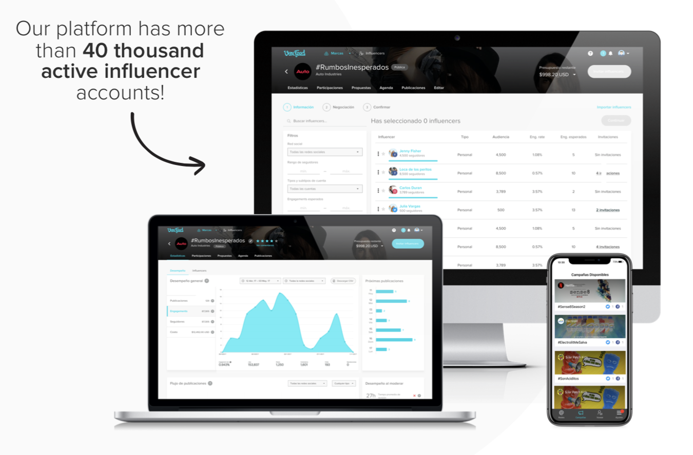 VoxFeed is a marketplace that offers technology to simplify, streamline and scale the collaboration between brands and influencers. The main capabilities of the technology are: - Selfservice & User Experience - Transparency and budget optimization - Communication with influencers - Immediate response - Advanced reporting - Content moderation - Automated payment system for influencers - Web and mobile applications