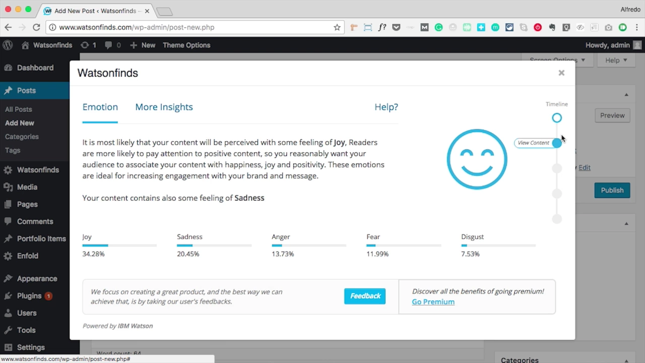 Watsonfinds is a Wordpress Plugin that uses artificial intelligence for analyzing your content and giving you insights about the emotions that your audience may perceive as they read it. Its main purpose is helping copywriters, brands, marketers or any person to always transmit the intended message by evoking the right feelings with their content. Watsonfinds relies on IBM Watson, which is currently the pioneer on cognitive computing and artificial intelligence.