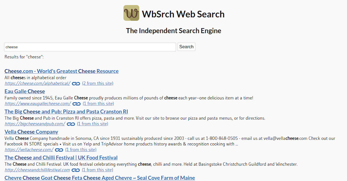 WbSrch is an independent search engine created in Portland, Oregon, USA. It was started as a hobby project to build a retro-style search engine shortly after AltaVista shut down and has grown beyond its humble beginnings.