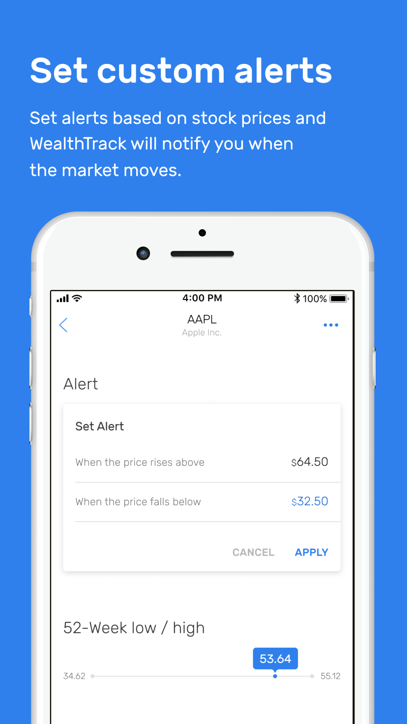 Mobile trading app that works with your broker: place trades, keep track of your portfolios, know what's happening on the market. First version will be focused on stock tracking. Available in December, 2017. It will help you to: Organize stocks Group your stocks into watchlists and pin the most important ones. ?ustomize notifications Set alerts based on stock prices and WealthTrack will notify you when the market moves. Stay fully informed Get the most useful information about stocks without leaving the App. Future plan: Portfolio management March, 2018 Track and control all your portfolio in one app. Fees information March, 2018 Be aware of why and how much you actually pay in fees. Trading May, 2018 Place trades right from the app using your own broker. Android version Late 2018 Enjoy the same functions on your Android device.