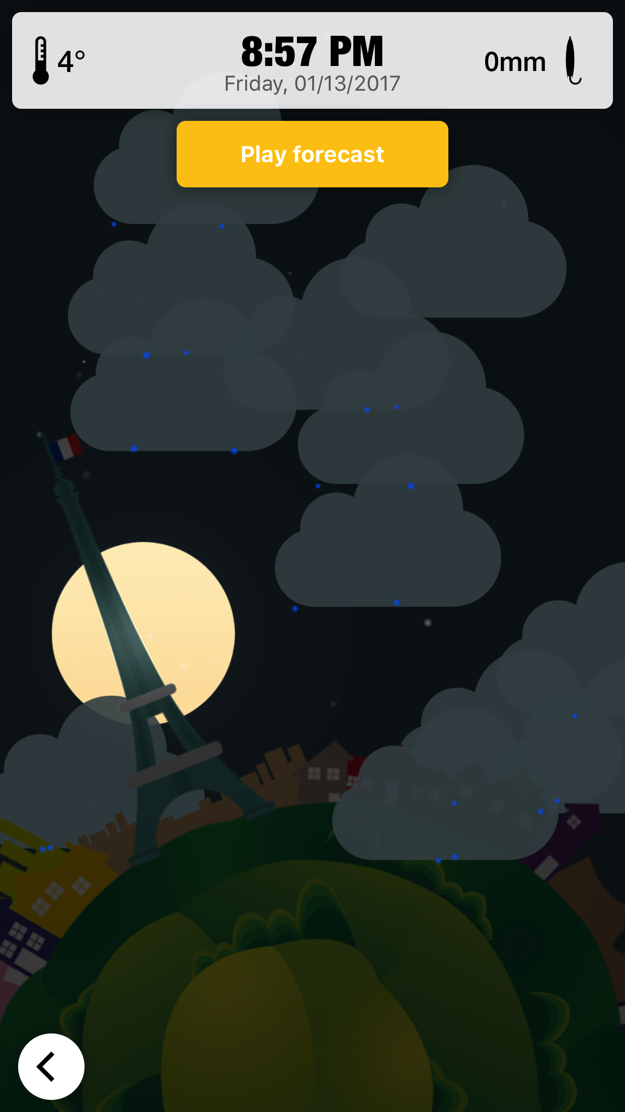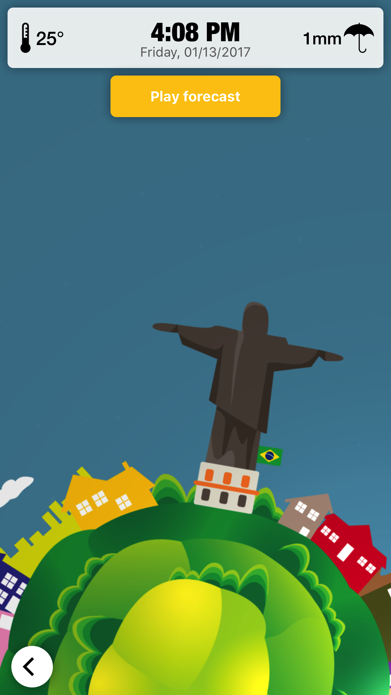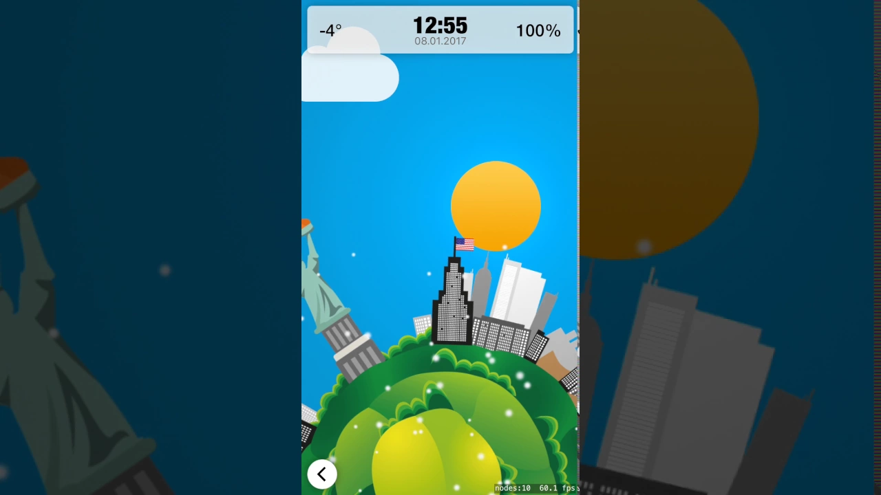 Spin the wheel and watch the weather changing in realtime. A very cool world-wheel defines our core component. This wheel allows you to move in time. While spinning the wheel, the weather changes in realtime. We tried very hard to put in lot's of details. For example: The sun is rising exactly, when it is rising in the real world too. (same with the moon, the whole weather,...!) NEW: You can watch a very cool 5-day-live-weather-forecast commented by Siri. Just lean back and enjoy the show. We designed localized world-images for the following countries: - USA (NYC, SFO) - Austria - Germany - Switzerland - France - United Kingdom - Brazil - Italy - Australia - Japan - China - Russia More are coming soon. Send as an email with the country you want to see next! The most wanted countries will be added within the next weeks! Designers, watch out! If you want to help us in covering the whole world with images, send us an email and we will send you a template to get started. We will then