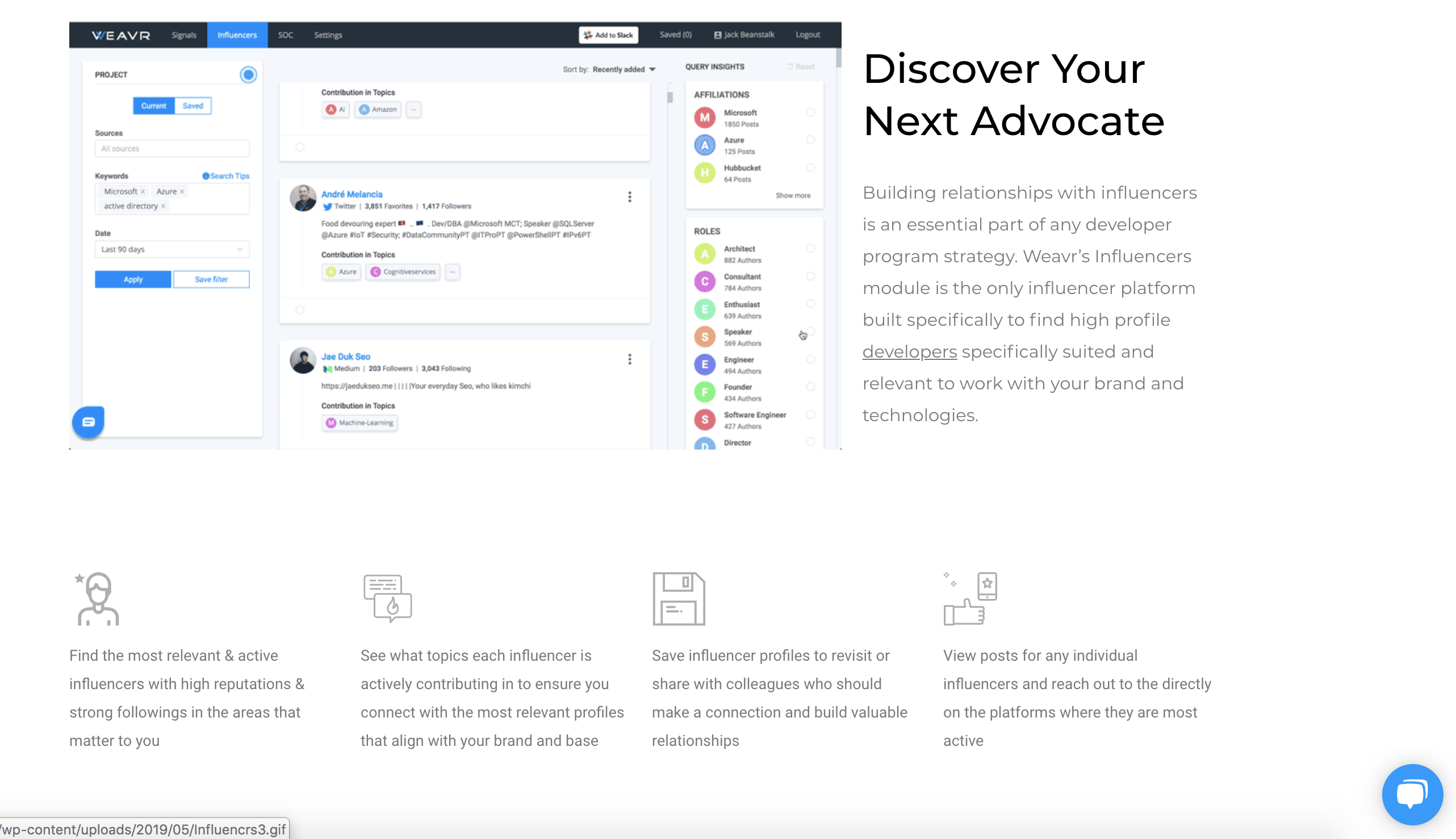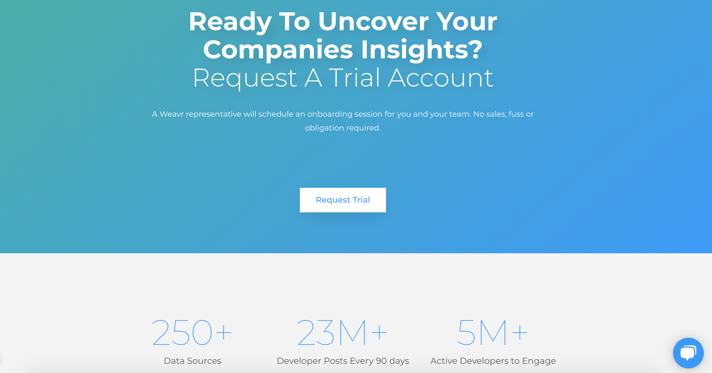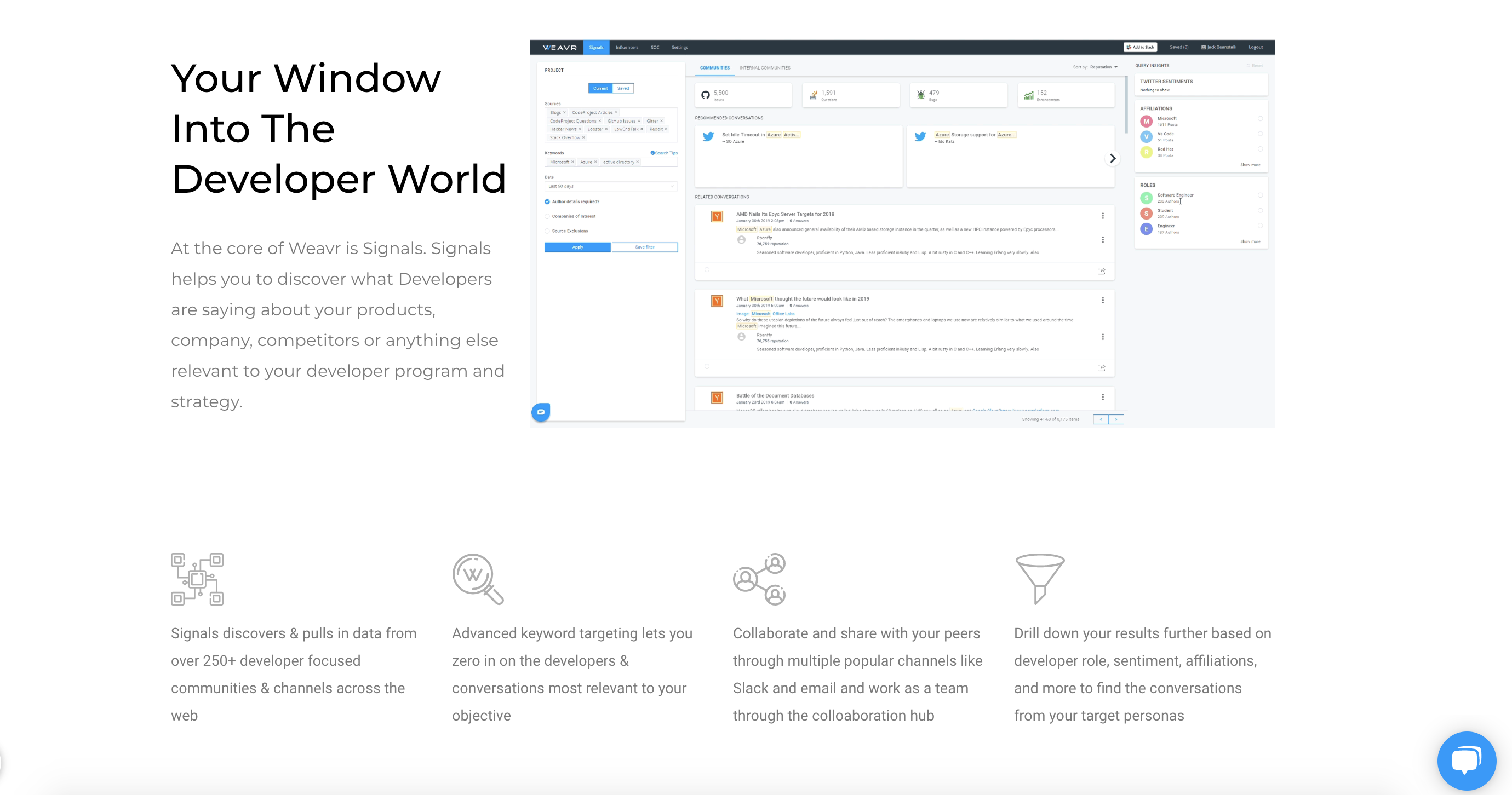 Weavr aggregates data from 250+ Data Sources and 23+ Million monthly developer posts to provide real time intelligence from developers across the web. We provide a window into the developer world to discover what is being said about your product, help find advocates for your technology as well as improve your support, content and engagement activities. Signals- Is your window to the Developer world. Weavr Signals discover what Developers are saying about your products, company, competitors or anything else relevant to your developer program and strategy. Influencers - Building relationships with influencers is an essential part of any developer program strategy. Weavr is the only influencer platform built specifically to find high profile developers tailored and relevant to work with your brand and technologies. Share of Conversation- helps you to make strategic decisions about where you should focus your support and content efforts so you can gain traction where it matters most.