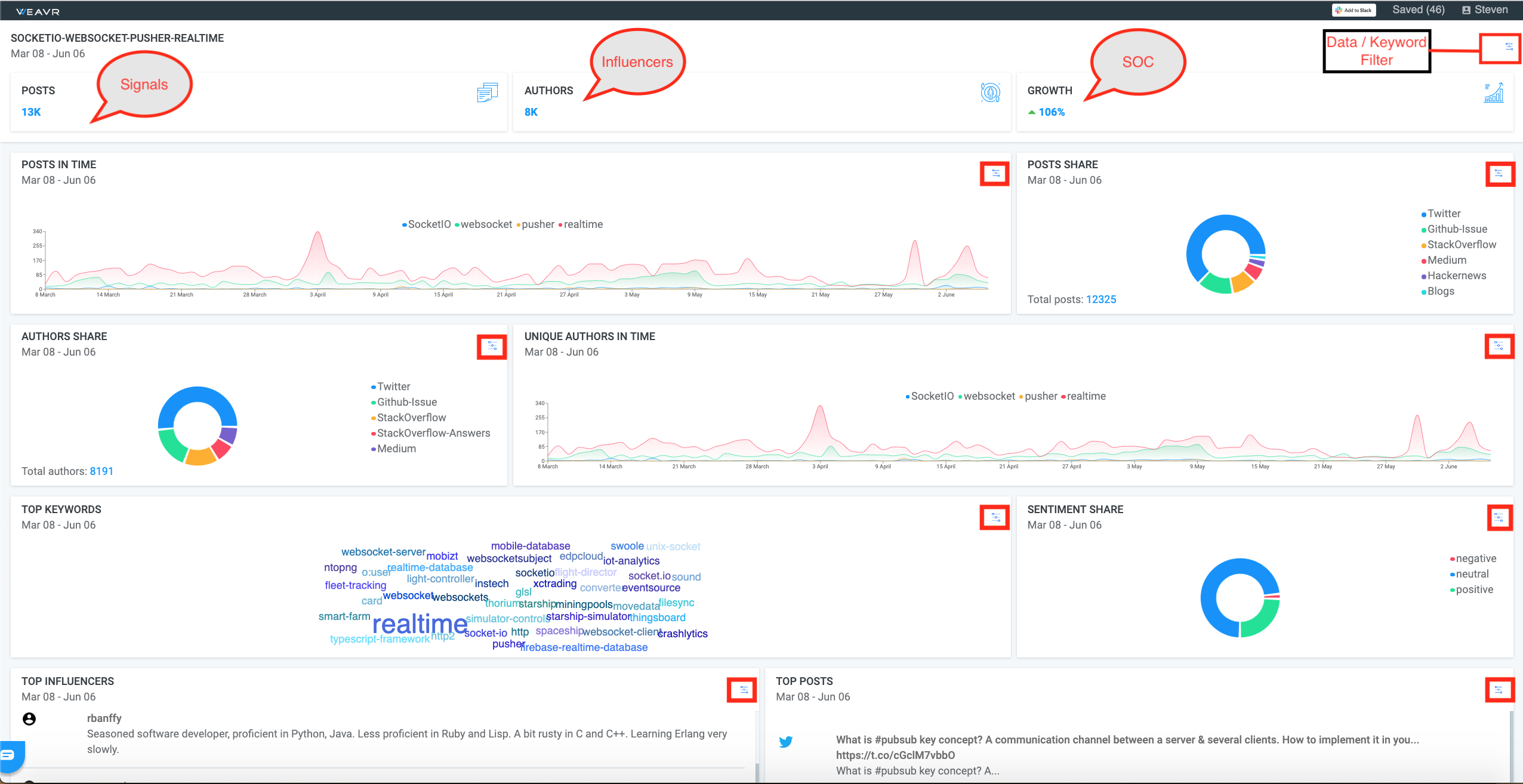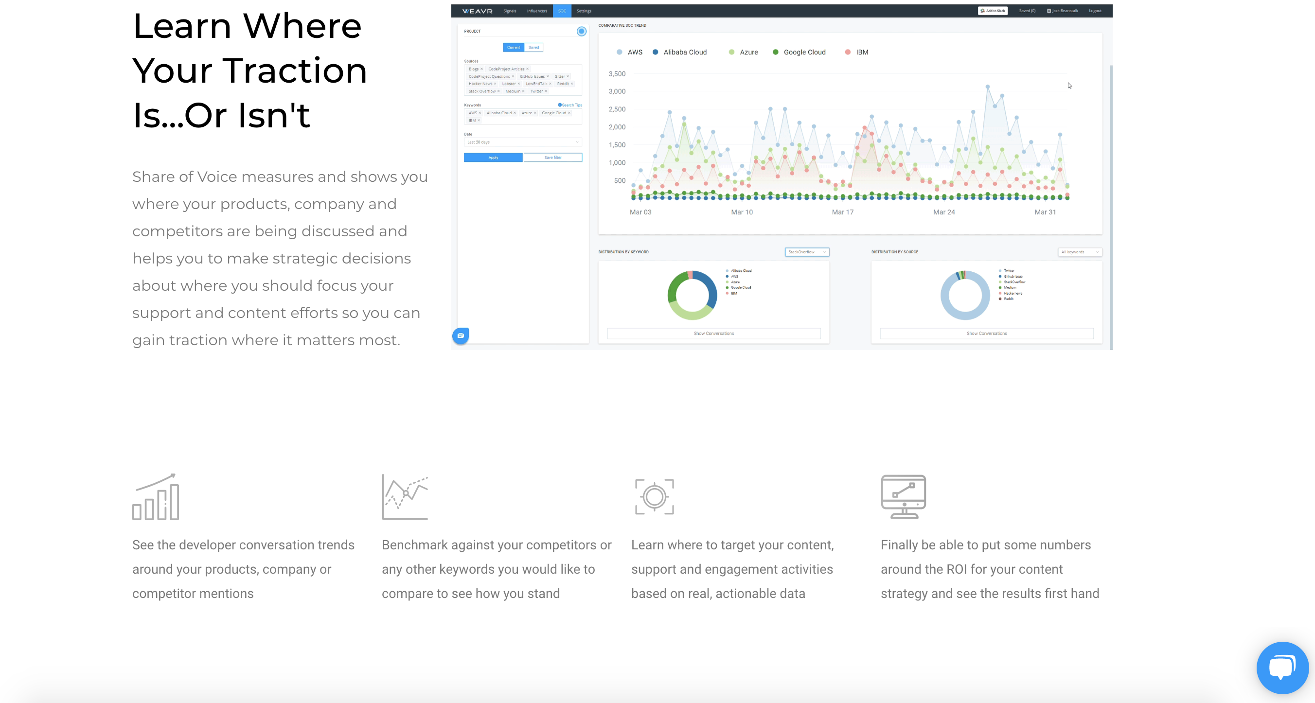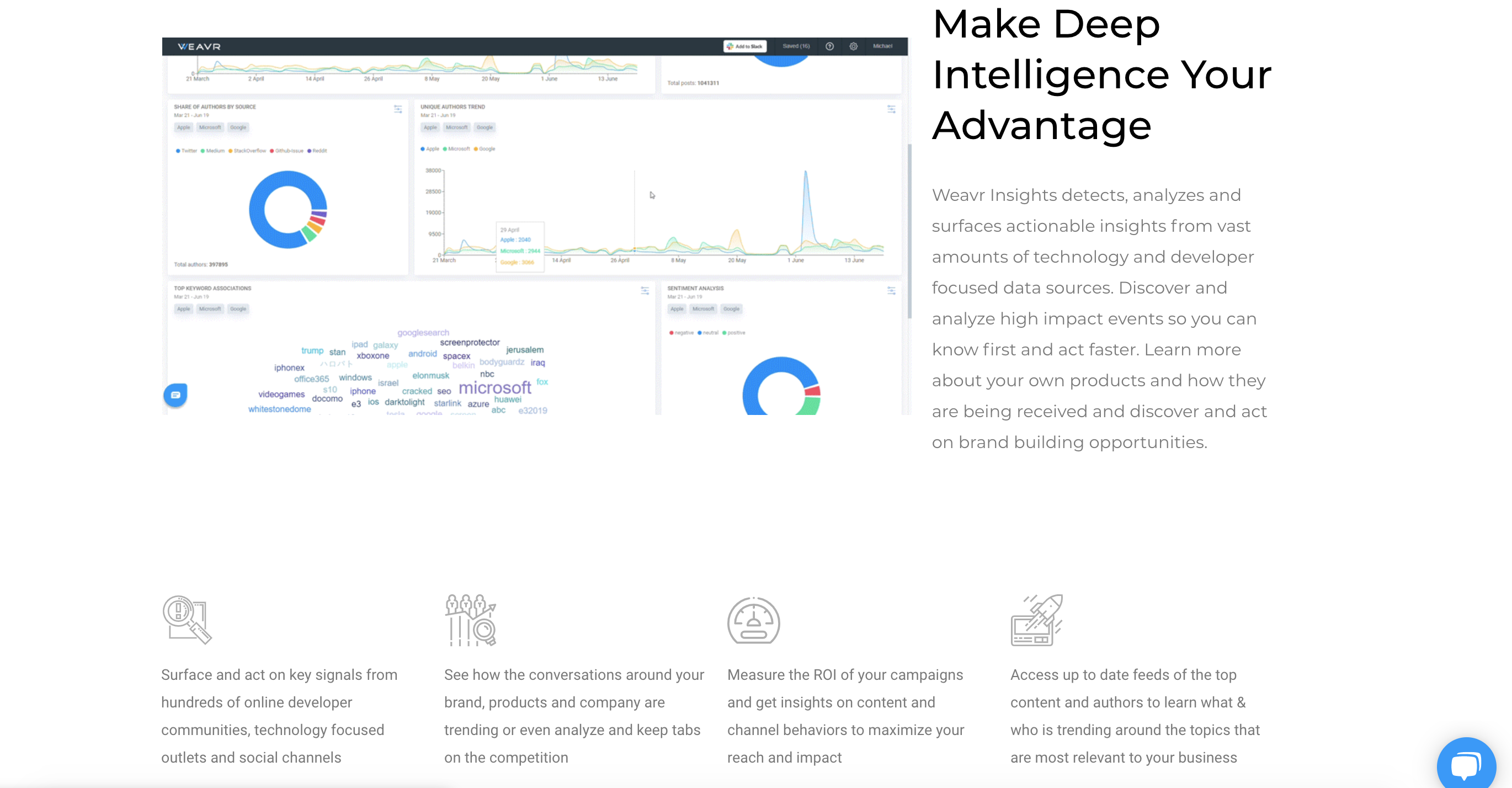Weavr aggregates data from 250+ Data Sources and 23+ Million monthly developer posts to provide real time intelligence from developers across the web. We provide a window into the developer world to discover what is being said about your product, help find advocates for your technology as well as improve your support, content and engagement activities. Signals- Is your window to the Developer world. Weavr Signals discover what Developers are saying about your products, company, competitors or anything else relevant to your developer program and strategy. Influencers - Building relationships with influencers is an essential part of any developer program strategy. Weavr is the only influencer platform built specifically to find high profile developers tailored and relevant to work with your brand and technologies. Share of Conversation- helps you to make strategic decisions about where you should focus your support and content efforts so you can gain traction where it matters most.