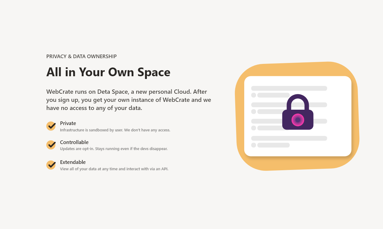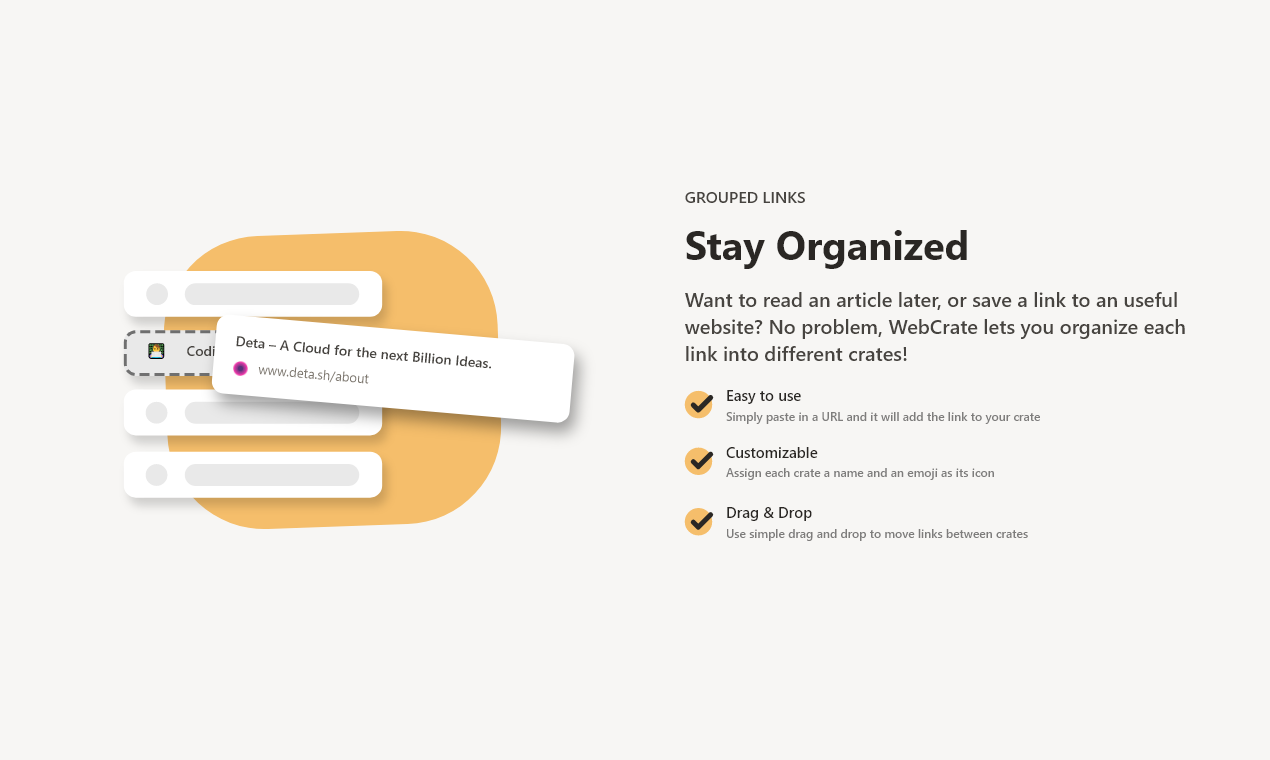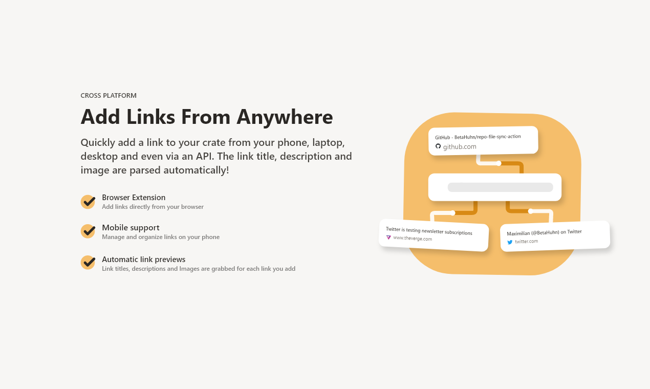 WebCrate helps you organize and share links, articles and more from around the web in a central place. It's open source & can be easily self-hosted thanks to your own personal cloud in Deta Space. Here are some of the key parts of WebCrate: ? Fast, minimal, and intuitive interface. I wanted something simple to use which helps me to never lose a link again thanks to a powerful quick search. ? Organize your links with crates. A crate can be thought of a collection of links which relate to the same topic. Use a crate for a particular project you are working on, a list of useful resources or organize anything else you like! ? Make your crate public and share it with the entire world! See this crate as an example. You can also subscribe to any public crate and access its links directly through your own dashboard. ? Everything runs in its own sandboxed environment for each user thanks to Deta Space. You get your own instance of WebCrate on the internet for you to access from all your devices! As a developer, I can't touch your instance — you remain in control of your data and updates to WebCrate. ?‍? WebCrate is also open source, report any issues you find, suggest features, or contribute directly with code on GitHub! To learn more visit webcrate.app or install WebCrate directly on Deta Space (https://deta.space/discovery/webcrate)! I hope you find WebCrate useful, and I'm looking forward to your feedback! ?
