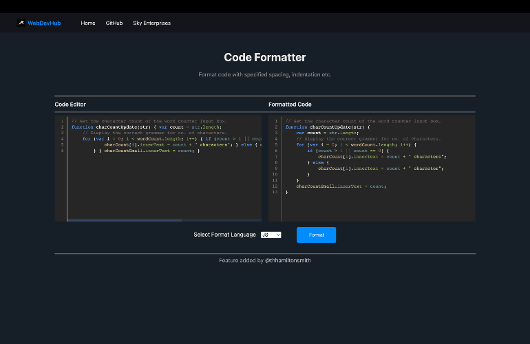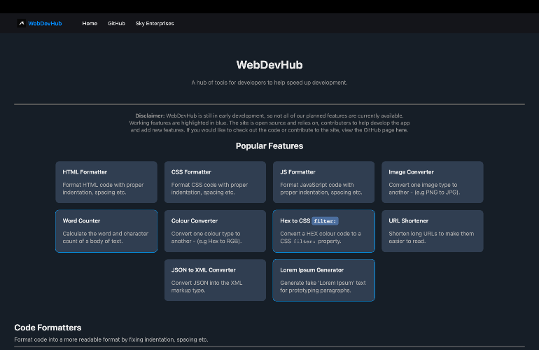 WebDevHub is designed to be one central place for developers, that offers a variety of tools to help with any developing needs. This includes code formatters, file converters, image compressors etc. A central hub with all the tools a developer might need makes it easier to focus on developing, rather than searching for different sites to find a working tool. WebDevHub eliminates this hassle. The site is open-source, designed to be made by the users. If there is a feature you want to add, a bug you want to fix etc, simply open a pull request.