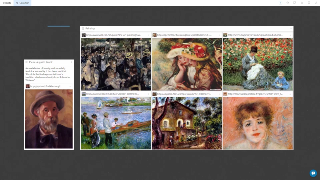 Information management for visual thinkers. Any content collected from the web automagically turns into an interactive card. Use drag and drop, a bookmarklet or even IFTTT to push your data into Webjets. Organize intuitively Webjets allows you managing any kind of information with ease. Place cards freely, or group them at the speed of thought. Present differently Choose the best presentation for your personal Collection of Information. Website: http://webjets.io/?utm_source=beta-page Signup: https://app.webjets.io/?utm_source=beta-page