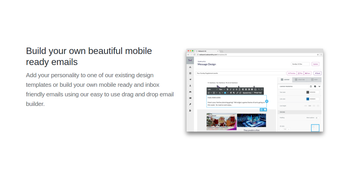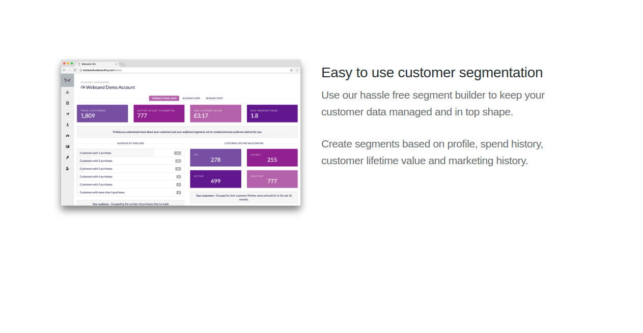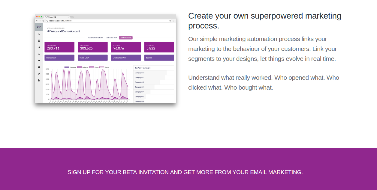 Websand is a new way for you to unlock the secrets of your customer data and change the way you use email marketing forever. Easy to use customer segmentation Use hassle free segment builder to keep your customer data managed and in top shape. Create segments based on profile, spend history, customer lifetime value and marketing history. Build your own beautiful mobile ready emails. Add your personality to one of our existing design templates or build your own mobile ready and inbox friendly emails using our easy to use drag and drop email builder. Create your own superpowered marketing process. simple marketing automation process links your marketing to the behaviour of your customers. Link your segments to your designs, let things evolve in real time. We can’t wait for you to try it. Sign up to get your beta invitation.