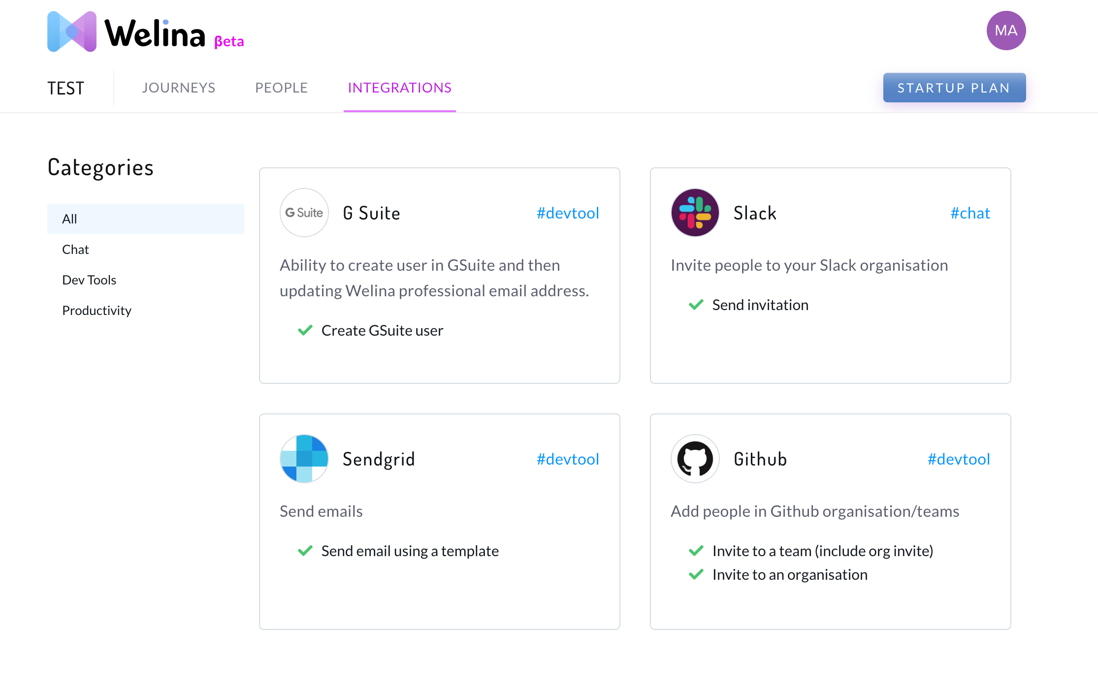 Welina is an online service offering to tech startup a way to enhance their employee Journeys. Working in tech you probably heard the question "Could you give me access to [pick any app name]?" a lot... We are working hard on solving it! Automation: We should avoid to handle manually any repetitive task. Welina offer on-demand automations for well known web services (gsuite, github, slack, sendgrid, ...). Employee Experience: Enhance employee experience configuring in advance what will be their journey in your company. Security: Never forget to unset right access when an employee leave your company. Take care of your datas.