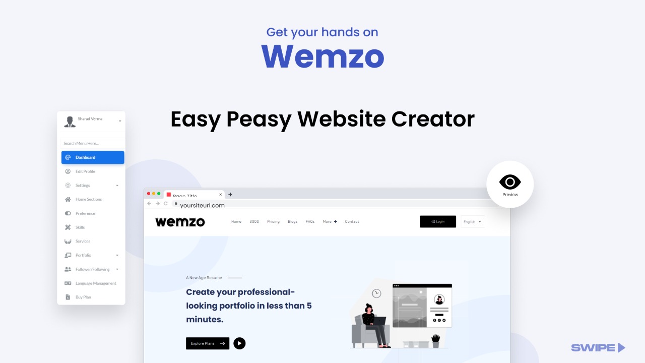 Wemzo is a powerful portfolio builder that produces interactive websites. The unique thing about Wemzo is that you don't have to spend hours or pay hundreds of dollars to get a website, one just has to spend few minutes to get the job done for a nominal price.