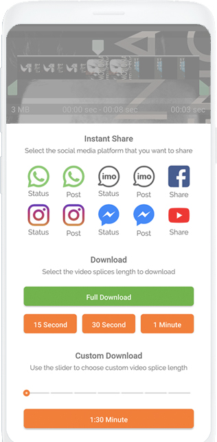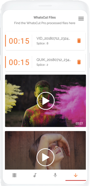 WhatsCut Pro is most powerful and smart tool to create and share videos / audios on multiple social media platforms and chat messengers: Whatsapp, Instagram, Facebook, IMO etc. Why WhatsCut Pro? ? Upload long videos or audio files as your social media or chat messenger status. ? One mobile application to update video/audio status on all social media platforms or chat messengers like: WhatsApp, Instagram, Facebook, IMO etc. ? Edit and Trim video / audio content from phone gallery ? Automatically split video / audio into 30 second parts to share as WhatsApp status. ? Do not require permanent phone storage space. ? Inbuilt media player and file manager ? A unique tool to record audio and share it. Note: Whatsapp, Instagram, Facebook, IMO etc. can support max 30 status at a time, so file manager only lists videos of length less than 15 mins.