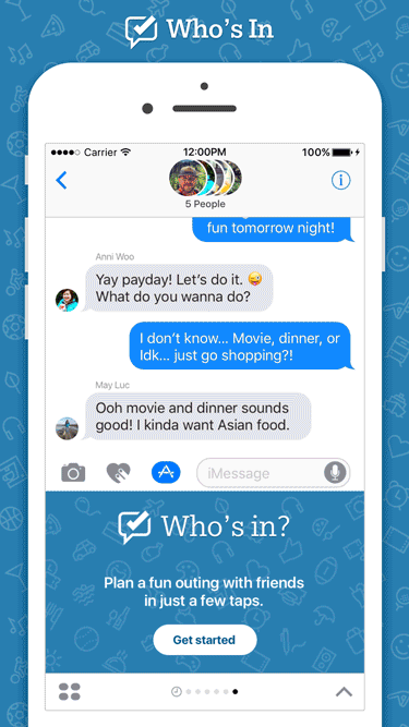 Who's In makes planning a night out with friends a breeze. There's no need to switch between a variety of apps and contacts to get everyone on the same page. With Who's In, you can find activities with Bing, suggest times to meet, then sit back as your friends vote for the best option.