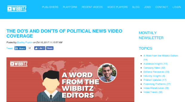 SIMPLE & SCALABLE VIDEO CREATION Video is the key to a successful digital, mobile, and social publishing strategy. Wibbitz is the video creation platform that will enable your success. -EDITORIAL CONTROL Tweak or alter videos created from your text and packaged with your branding. We make editing simple, so you have more time to craft premium content. -HIGH-QUALITY VIDEOS We value quality as much as you do, which is why every video created with Wibbitz uses licensed, top-notch photo and video content to tell your story. -MINIMAL PRODUCTION TIME News changes fast, and your content should too. Our technology uses advanced algorithms unparalleled in the industry to produce videos within seconds. -MORE REVENUE OPPORTUNITIES Video ads are undeniably the big and bright future of digital advertising. Capitalize on your content by easily building up video inventory.