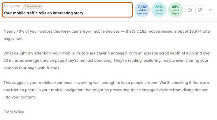 Wiley is a privacy-first web coaching tool that watches your website and sends you one specific observation every day — a plain-language nudge about what's working, what isn't, and what to do next. Delivered at a time you choose. Most analytics tools hand you data and leave you to figure out what it means. Wiley does the interpretation for you. Every day, Wiley analyzes your site's traffic patterns, referral sources, scroll depth, accessibility signals, SEO findings, and content performance — then delivers one clear, actionable observation calibrated to your actual goal. Wiley's tracking script is privacy-first: no cookies, no consent banners, no surveillance-level data collection. A free tier coaches from publicly visible data with no script and no credit card required. Paid plans add full behavioral tracking, conversion events, social presence analysis, and deeper coaching starting at $7/month after a 7-day free trial.