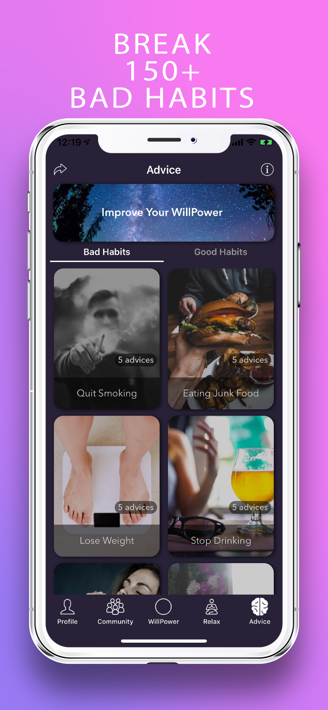 It came to our attention that there doesn't seem to be an App that tackles the WillPower some people lack, Many people have bad habits such as smoking, overeating, gym avoidance, alcohol consumption, not paying enough attention to their relationships and so many more. Our App will diminish those bad habits with unlimited guided and unguided meditation, relaxation techniques, easy daily tasks to let you forget and avoid temptations, calming music and thousands upon thousands of medically proven advice to help destroy bad habits from biting nails, cheating all the way to anger managing. With over 200 bad habits and many more to come, we shall train and develop you to overcome these habits We hope you check out our app and that it will help you to become a better you.