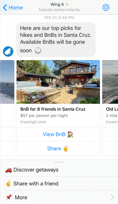 Wing It is a Facebook Messenger bot that tries to get you out of that rut. You punch in your criteria, and it’ll pop up every once in a while when it finds trips that fit the bill, recommending accommodations and an activity or two in the area. Wing It asks just a few questions off the bat: Where do you live? How far do you want to go? Is it just you and a partner, or a big group of friends? How much is each person looking to spend? A few minutes later, it’ll respond with a short list: a few places to stay and some things you might want to do while there. Right now, that’s mostly hikes and trails; eventually, the Wing It team hopes to expand their knowledge base out to things like kayaking trips, rock climbing, or nearby surf spots.