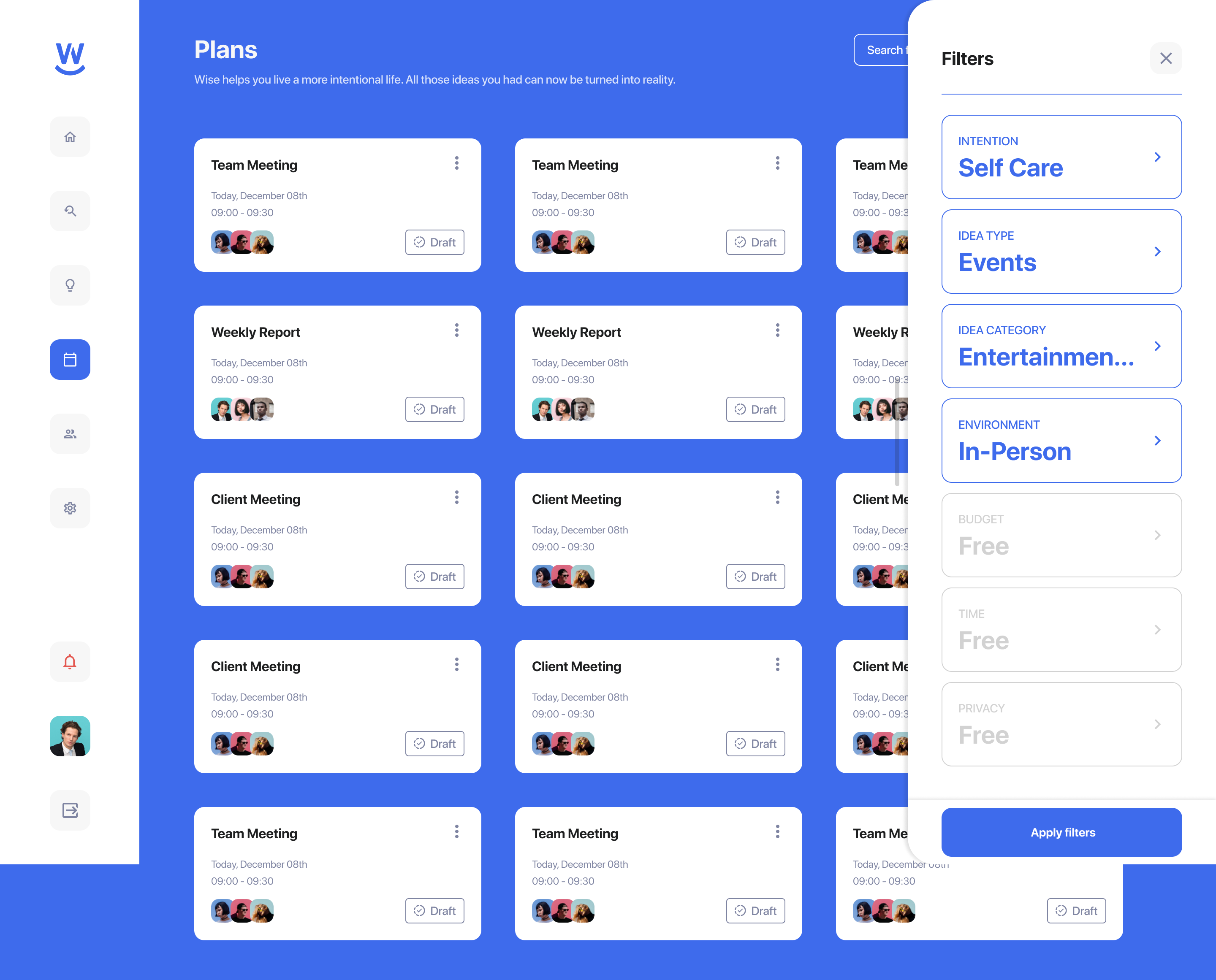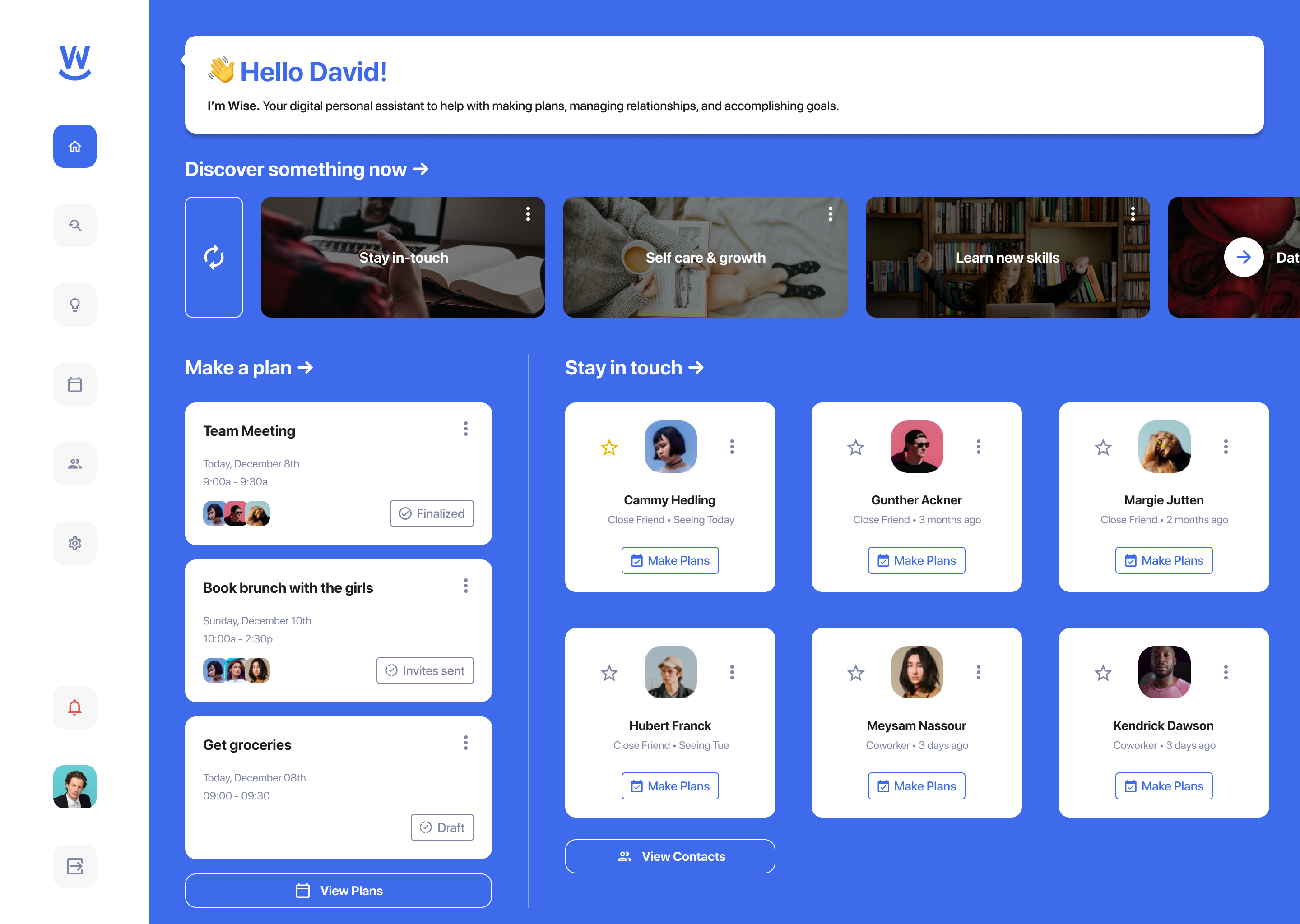 Driven by user goals and intentions, Wise makes suggestions to help people improve their wellness and live better lives. Machine learning optimizes the recommendations to more accurately create the outcomes desired by the user. When a suggestion is accepted, Wise automates the tasks required to make the activity happen. Over time, Wise will bundle everything, including the people, products, services, and content, required to help users achieve their goals. Specifically, Wise focuses on helping users: - Stay connected with people - Focus on self-care - Live an active lifestyle - Learn relevant skills - Balance work and life - Be more prepared Wise simplifies planning into three key stages: discover, plan, and do. During discovery, users receive ideas based on their interests, like fitness activities, content, recipes, or adventures. During planning, Wise simplifies scheduling, finding a location or venue, and logistics, like ordering an Uber, event supplies, or reservations. During the ‘do’ stage, users receive a personalized dossier, including helpful info on the people and experiences scheduled.
