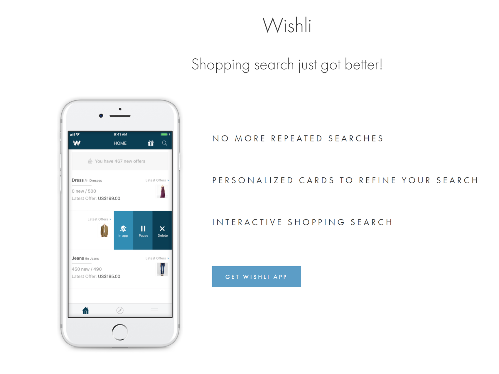 Wishli helps you save time and find right products by making shopping search hassle free. -NO MORE REPEATED SEARCHES Wishli organizes your shopping searches and keeps them updated so you can continue from where you left off. -CUSTOMIZE YOUR SEARCH Swipe through personalized cards to refine your search. -INTERACTIVE SHOPPING SEARCH Give feedback to Wishli on what you like and what you don't to refine your search further. -BUY RIGHT PRODUCTS When you are ready, buy the right products. -DISCOVER GREAT PRODUCTS Explore recommended and trending products.
