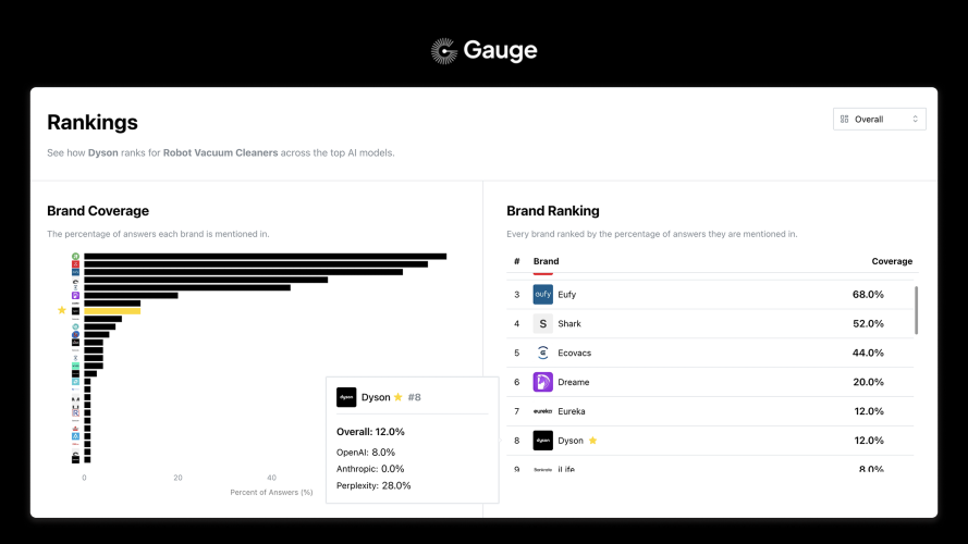 Gauge helps your company show up more in AI answers. Why should you care? Google searches are falling for the first time ever (and Google itself is moving to AI answers). Gartner predicts AI chatbots will capture 25% of search volume by next year With traffic leaving search, traditional SEO is dead. Our customers are seeing inbound AI traffic double every quarter. Gauge measures how often you and your competitors are referenced by AI, and derives insights from changes in the data over time. We came across this problem through an Open Source Day hosted by YC. There, we heard from a huge range of speakers, including Vercel, Elastic, Resend, and Airbyte. A consistent theme across every speaker was the new inbound they were seeing from ChatGPT. In just a few weeks, Gauge reached the front page of HN, saw over 40,000 organic users, and found its first design partners. Our customers include LendingTree, ChartHop, Resend, Helius, Standard Metrics, and more. If you’re curious in how often AI mentions your brand, learn more at withgauge.com.