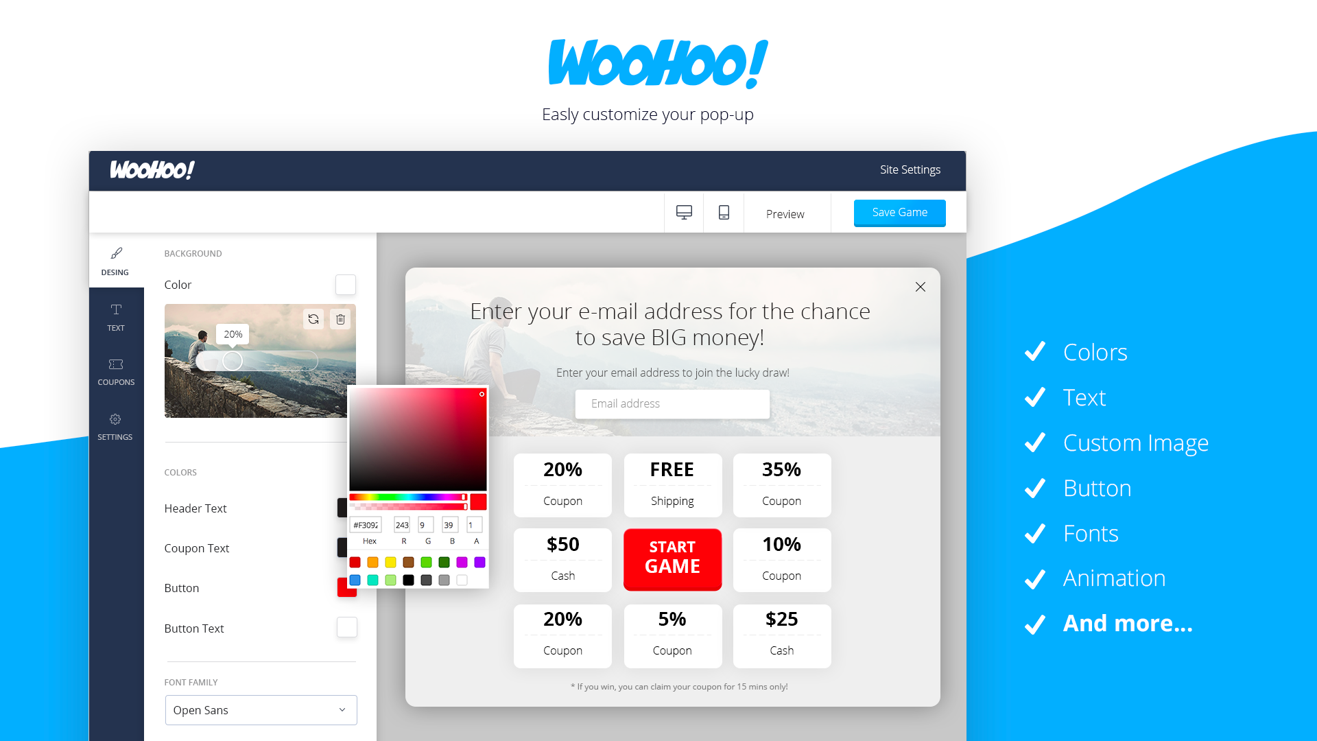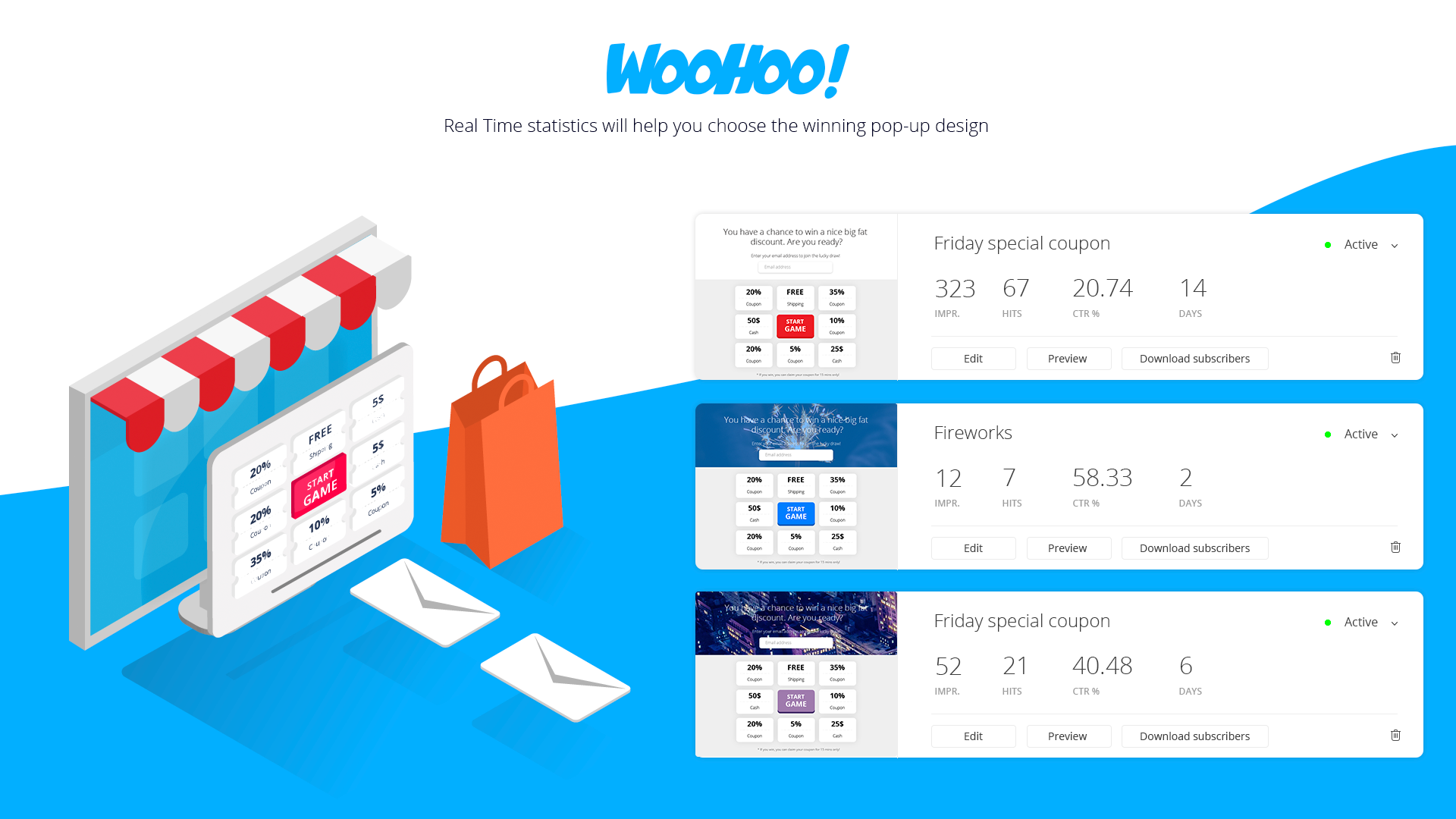 Who said pop-ups can’t be fun? by adding gamification to your pop-ups you can increase subscribers and boost your sell’s. It’s a Win-Win situation the customers get a great experience and you increase your meailng list and closing more sell’s WooHoo’s interactive, entertaining pop-up games, combined with YOUR customized coupon, promotion, and incentive strategies put the wheels of success into motion. The rest is simple and easy! WooHoo’s enables management and customization of your games and campaigns easily, and advanced analytics provide real-time insight and adaptability into your campaigns. Success is inevitable – WooHoo WILL help you grow your email subscriptions, increase your conversion rates and will help you generate more revenue!