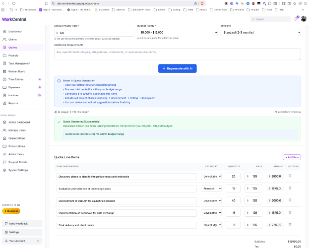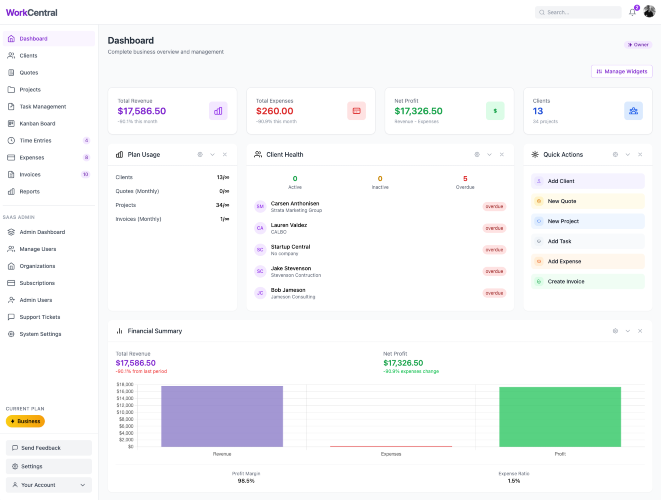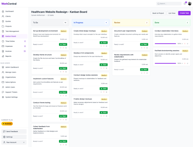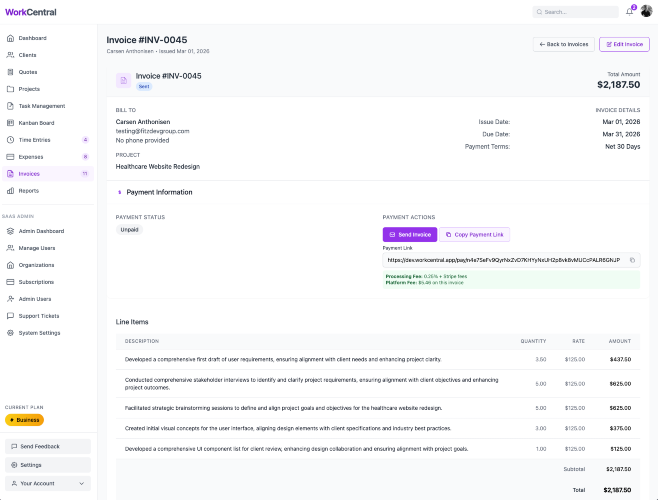 WorkCentral is a freelance business management platform that solves a problem every independent professional knows too well: the gap between tools. Most freelancers, consultants, and small agencies run their business across a patchwork of disconnected apps — one for proposals, another for project management, a third for time tracking, a fourth for invoicing, and a spreadsheet to tie it all together. Every time a client accepts a quote, you manually recreate the project in another tool. When the work is done, you export time entries and retype them into an invoice. When the invoice goes unpaid, you hope you remember to follow up. WorkCentral eliminates all of that by connecting the full workflow in a single platform. Here's how it works: AI-Powered Quotes — Describe a project, set a budget range and your hourly rate, and WorkCentral's AI drafts 4-7 categorized line items in seconds. Three billing types are supported: fixed price, not-to-exceed, and time-and-materials. Quote versioning keeps a full history of changes. Clients review and accept quotes online through a secure link. Automatic Quote-to-Project Conversion — When a client accepts a quote, WorkCentral automatically creates a project with tasks. AI breaks each quote line item into 3-7 actionable subtasks, organized on a kanban board. No manual data entry, no copy-pasting between tools. Time Tracking — Track hours directly against project tasks with a flexible rate hierarchy that cascades from task to project to user to organization level. Every minute is tied to the work it belongs to. Smart Invoicing — Generate invoices from your tracked time with one click. Five grouping options let you organize line items by project and task, by project, by user, by date range, or as individual entries. AI polishes your time entry descriptions into professional invoice language. A 7-step automated reminder sequence handles follow-up so you never send another awkward "just checking in" email. Online Payments — Clients pay through a secure Stripe-powered link. You get paid directly to your bank account. No chasing checks, no waiting for bank transfers. Expense Tracking — Full expense management with receipt uploads and categorization, so you have a complete picture of project profitability. Reports (Professional plan and above) — Five report types: Profit & Loss, Cash Flow, Client Intelligence, Project Performance, and Revenue Intelligence. Team Management (Business plan) — Invite team members with 20+ granular permissions. Built for the freelancer who's grown into a project coordinator managing subcontractors. All AI features use a bring-your-own-key model with the OpenAI API, available on every plan including free. WorkCentral is currently in public beta. Beta users get all paid plans free for the first year, then 50% off for life (founder pricing).