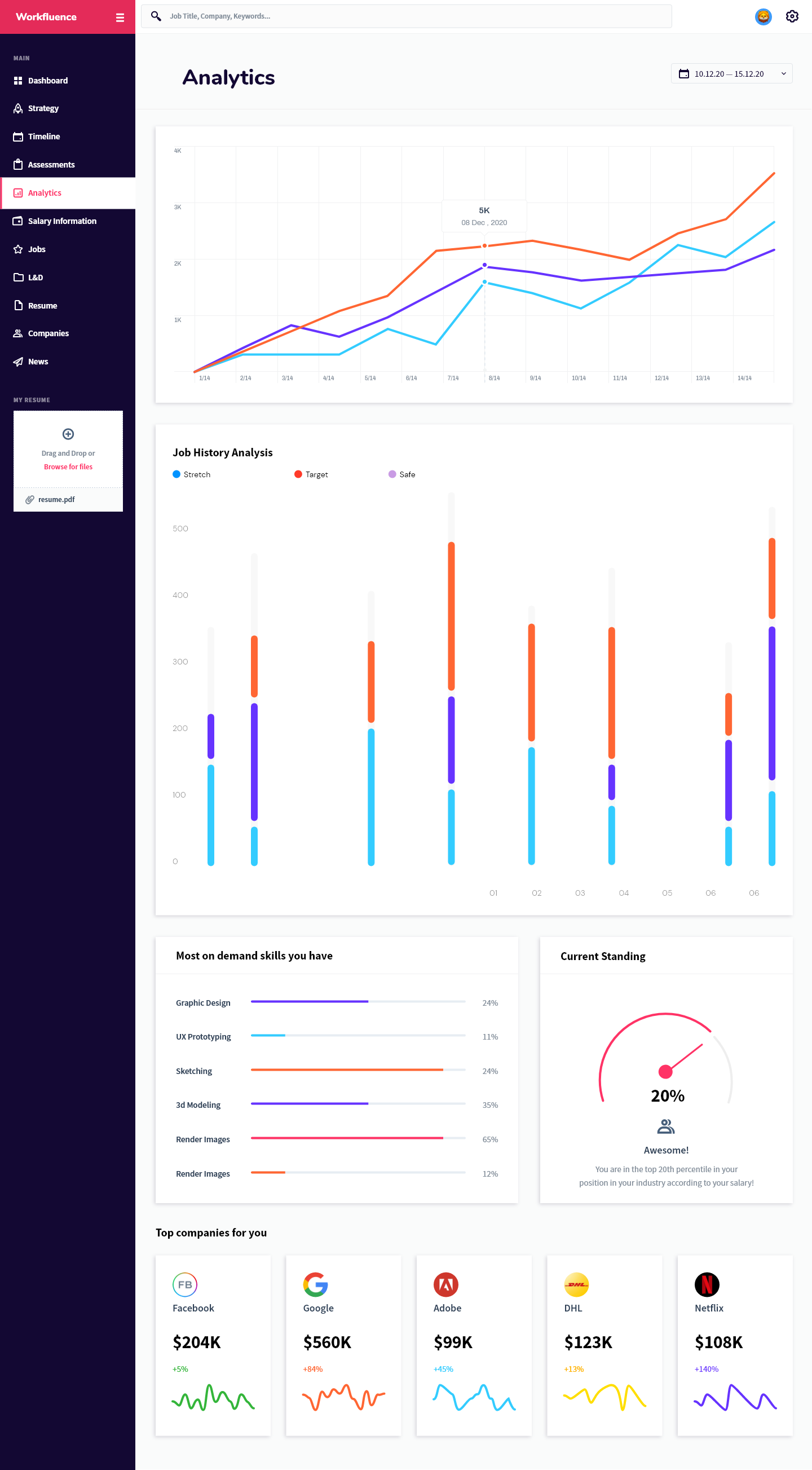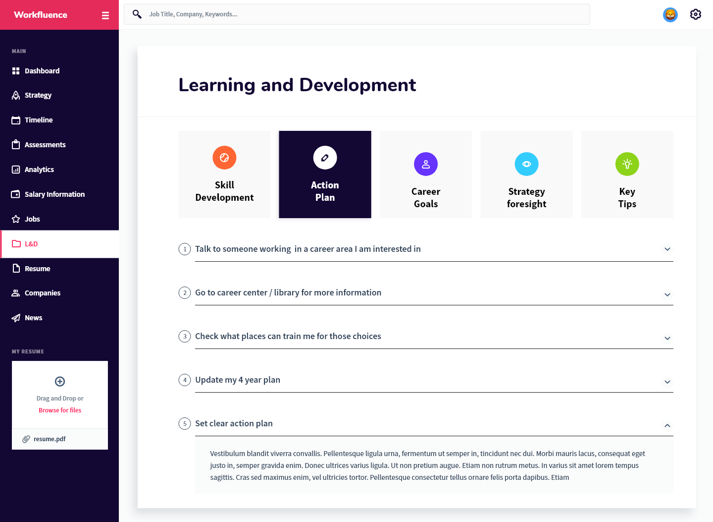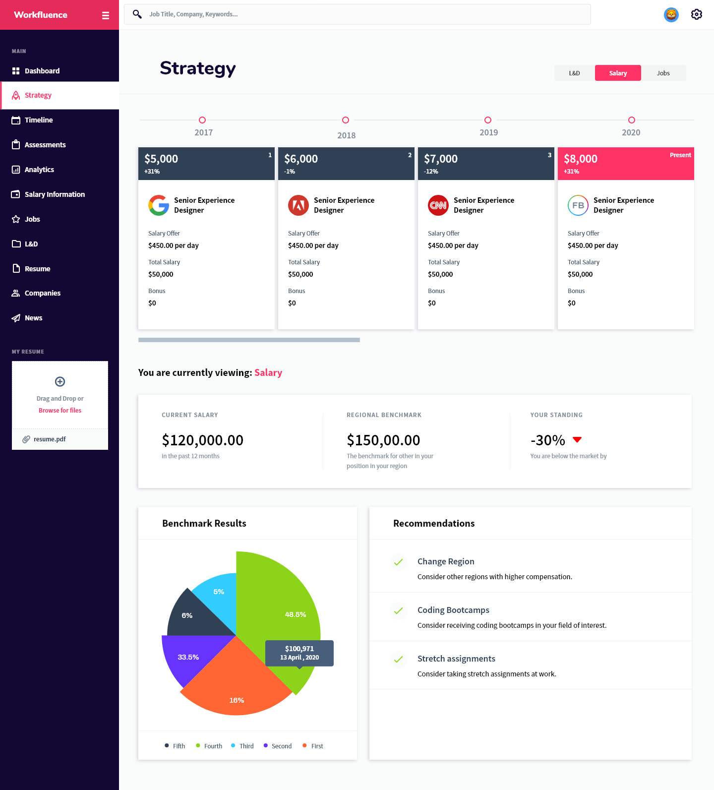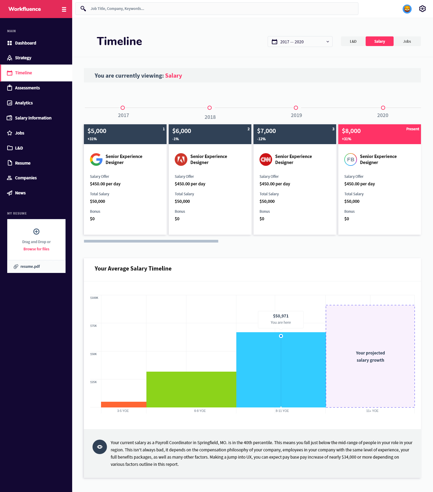 Workfluence uses AI-powered technology to create customized career strategies and career maps to help you move forward and make data-driven decisions to achieve both your short and long term professional goals. We take into consideration your career goals then provide a tangible strategy to achieve it with respect to learning and development opportunities, compensation expectations, jobs that align to your overall strategy, companies that you should consider, as well as an industry specific news feed so you're aware of what's happening in your market. The best part of our technology is that we are predictive, AI-driven, and interactive; as you grow, develop or have changed interest, the platform will adjust its strategy. It will also keep an eye on your specific market and make the best suggestion for you to stay competitive. We show ambitious professionals the right career move at every step. Our AI engines are trained to use algorithms based on years of millions of data points, allowing it to predict and suggest the best career moves for you to keep you ahead of the market. There is no more confusing career pathing. We are here to make the right choice easier for you. By spending your time only on high impact moves you are able to improve performance and grow with confidence, increase your marketability, set yourself up for promotion and stay ahead of the game. Our aim is to take the uncertainty out of life-changing decisions. Workfluence is a "career GPS", guiding you around all possible career turns so that you can know the right career direction at every step. More than just a job board—we are a career compass.