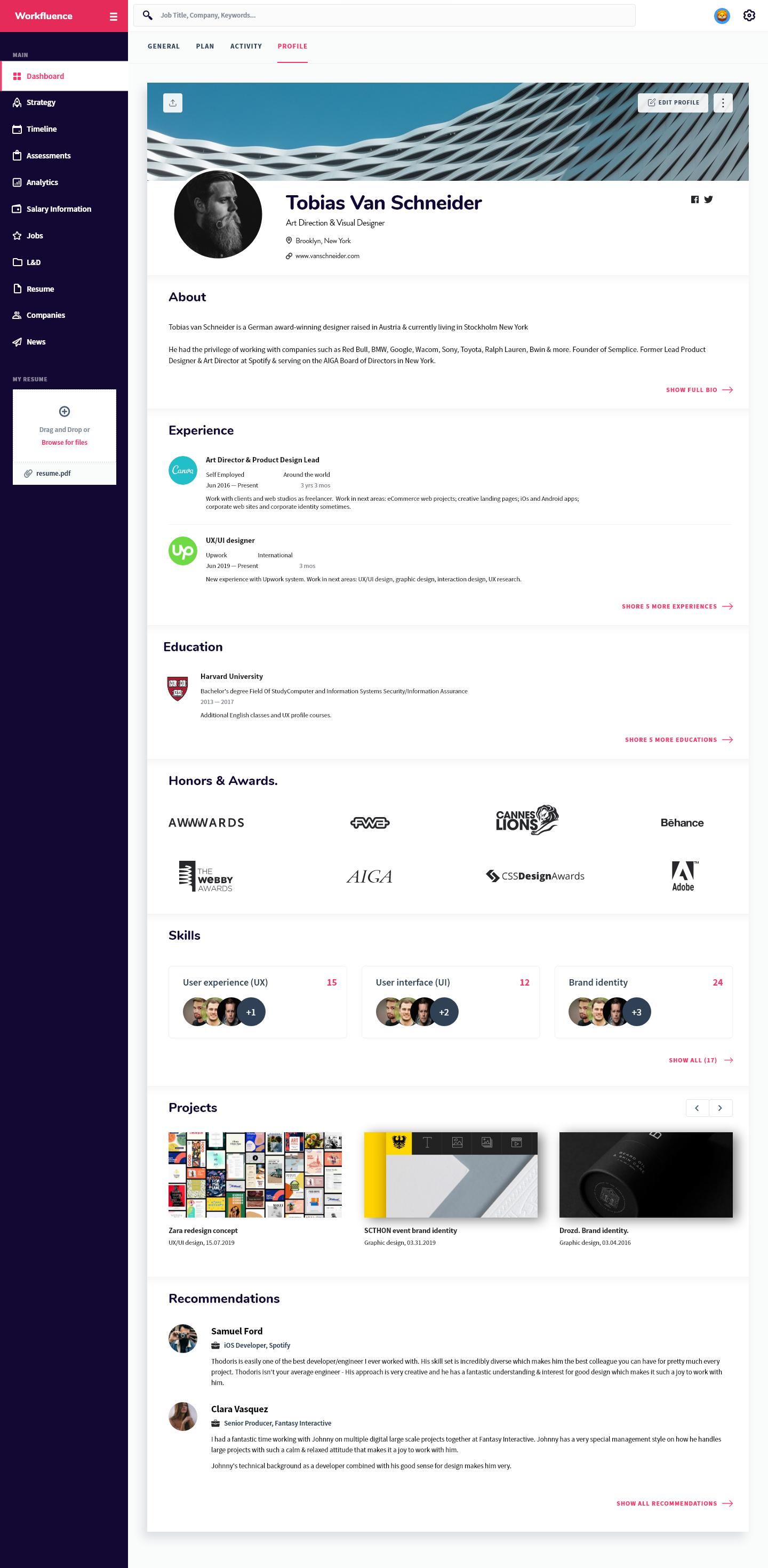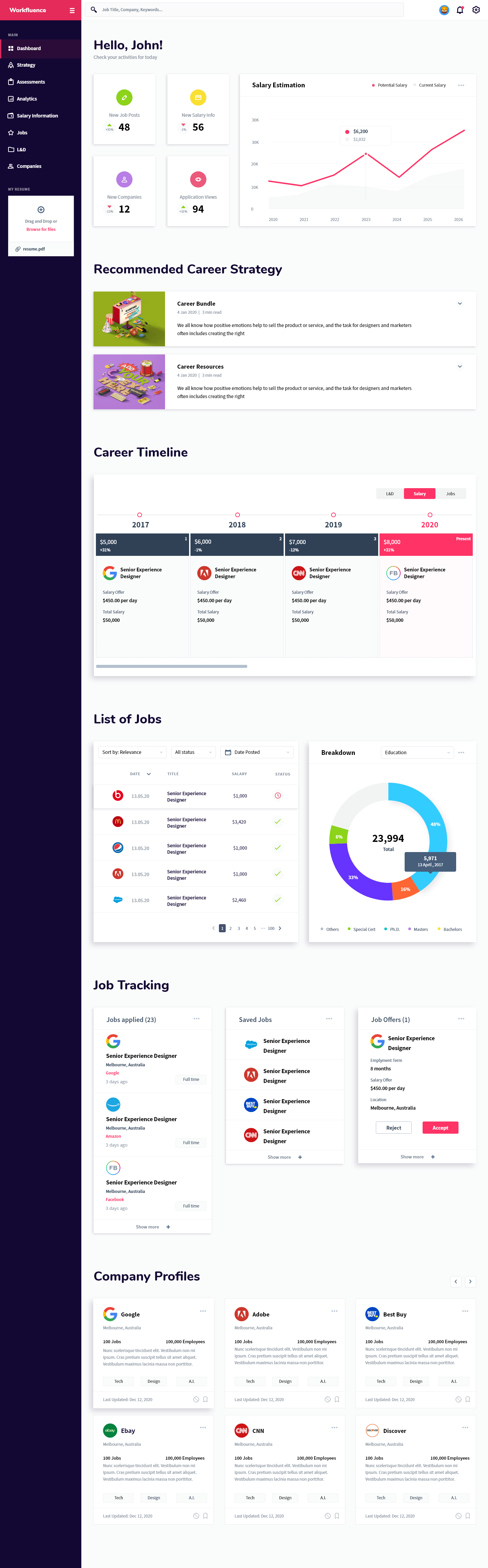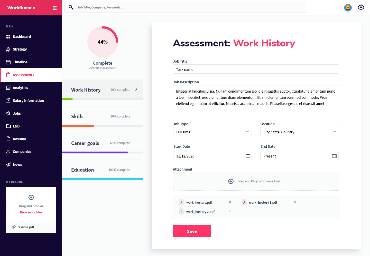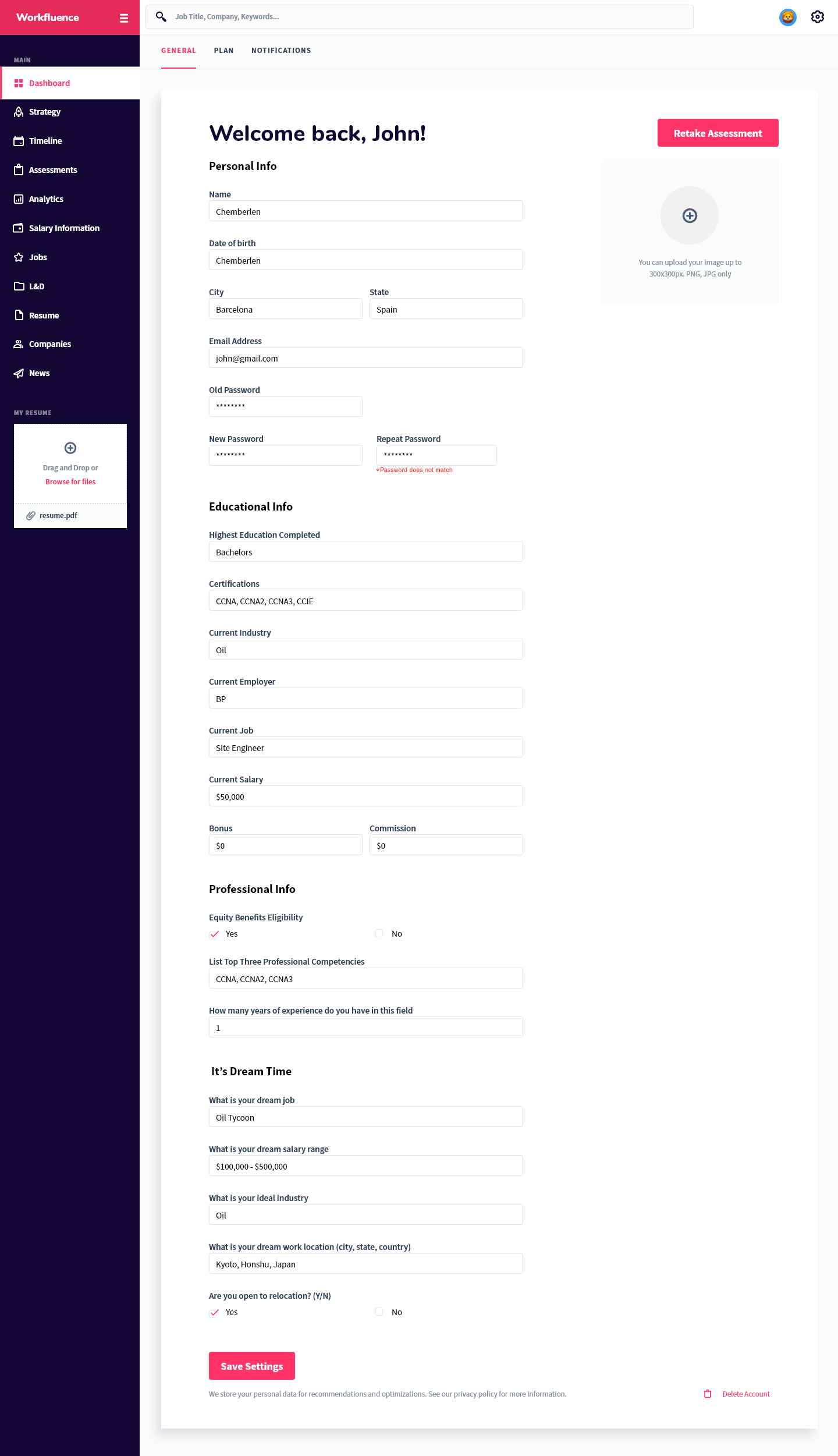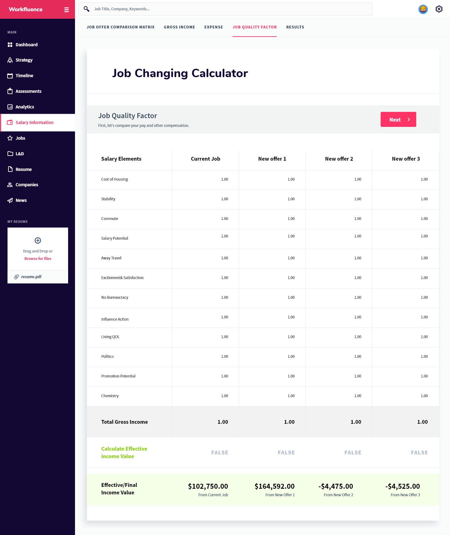 Workfluence uses AI-powered technology to create customized career strategies and career maps to help you move forward and make data-driven decisions to achieve both your short and long term professional goals. We take into consideration your career goals then provide a tangible strategy to achieve it with respect to learning and development opportunities, compensation expectations, jobs that align to your overall strategy, companies that you should consider, as well as an industry specific news feed so you're aware of what's happening in your market. The best part of our technology is that we are predictive, AI-driven, and interactive; as you grow, develop or have changed interest, the platform will adjust its strategy. It will also keep an eye on your specific market and make the best suggestion for you to stay competitive. We show ambitious professionals the right career move at every step. Our AI engines are trained to use algorithms based on years of millions of data points, allowing it to predict and suggest the best career moves for you to keep you ahead of the market. There is no more confusing career pathing. We are here to make the right choice easier for you. By spending your time only on high impact moves you are able to improve performance and grow with confidence, increase your marketability, set yourself up for promotion and stay ahead of the game. Our aim is to take the uncertainty out of life-changing decisions. Workfluence is a "career GPS", guiding you around all possible career turns so that you can know the right career direction at every step. More than just a job board—we are a career compass.