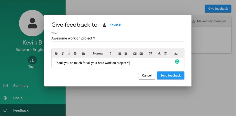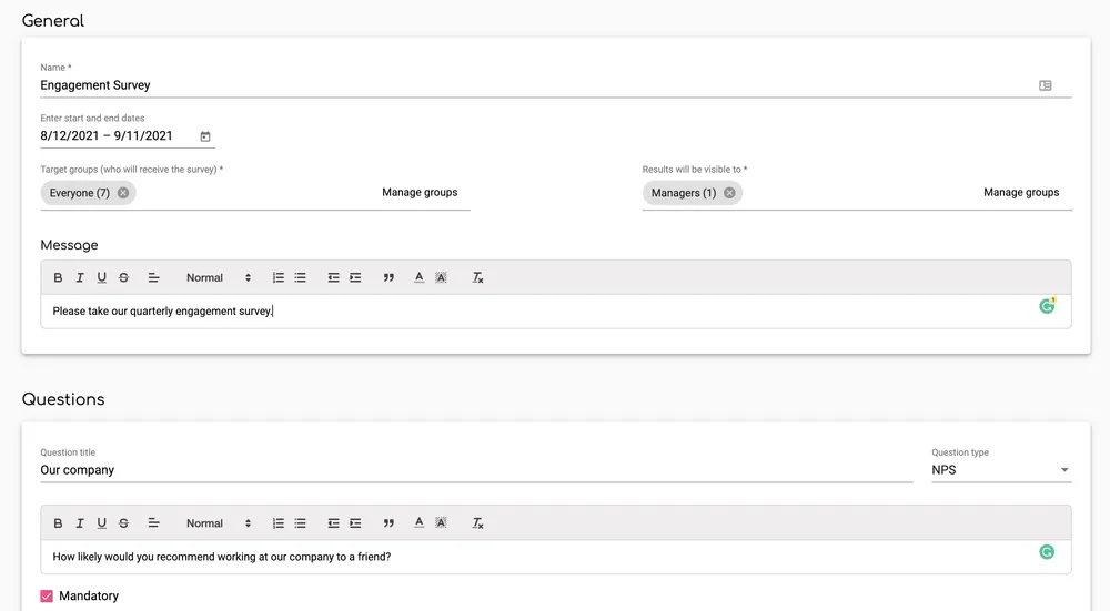 Modernize your company's HR processes with tools including surveys, 360 feedback, goal settings, feedbacks, org charts and many more. Gather insight with internal surveys Create custom surveys and gather data from targeted employee groups. Send out Engagement surveys, eNPS and detect potential problems in your organization proactively. Help your employees to grow with anonymous 360º feedback. Create and track goals Create and track goals for the entire organization. Cascading structure and all the tools you need to build a culture around achieving results. Give and receive feedback Give feedback be it for improvement or endorsement to your colleagues easily and create a healthy culture of respect and progress. Internal knowledgebase Share information in the included internal site and build up a common knowledgebase for your company. Employee directory Keep a list of your employees, view them in an organization chart and enable your colleagues to find each other with ease.