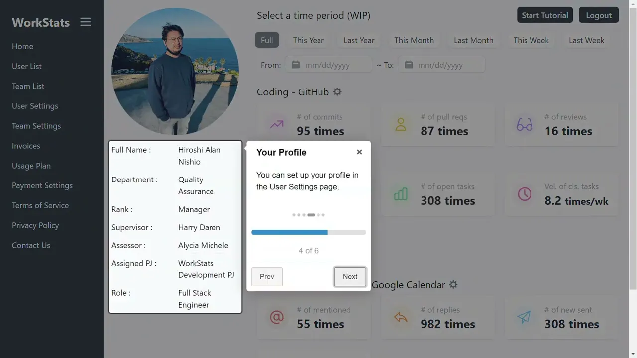WorkStats is a dashboard tool for engineers and project managers to visualize their productivity and the amount they contribute. It aggregates various numbers from platforms used by members and teams, such as GitHub, Asana, Slack, etc. For example, you can track your own and your team's numbers over time and use them as a barometer of productivity. You can compare your productivity with the numbers of other teams in your company or other companies in your industry to see if your current productivity is good or bad. In the internal evaluation process, it can be used to improve the validity from a third party's point of view or to compare perceptions with those of the person being evaluated.