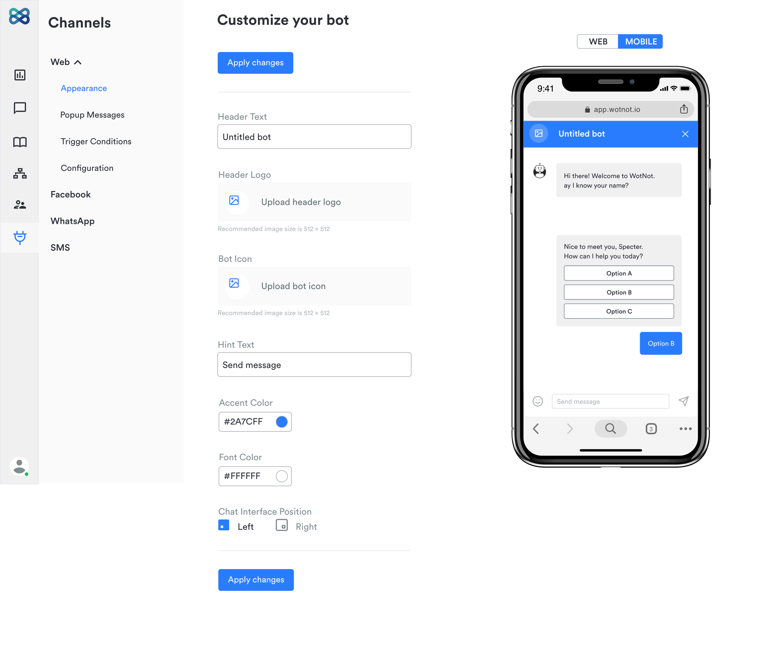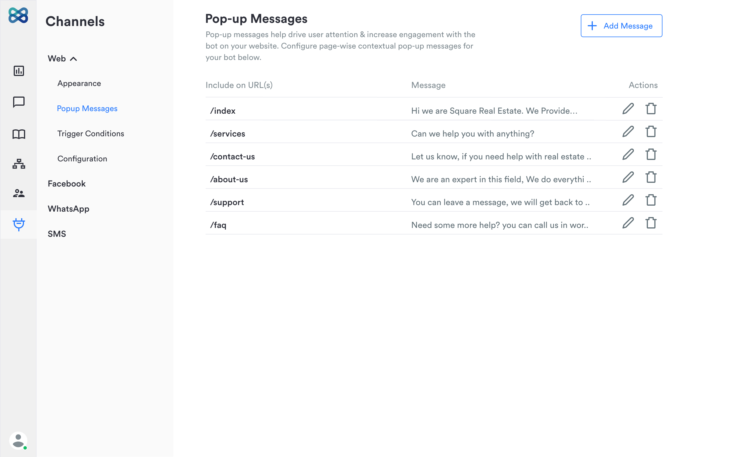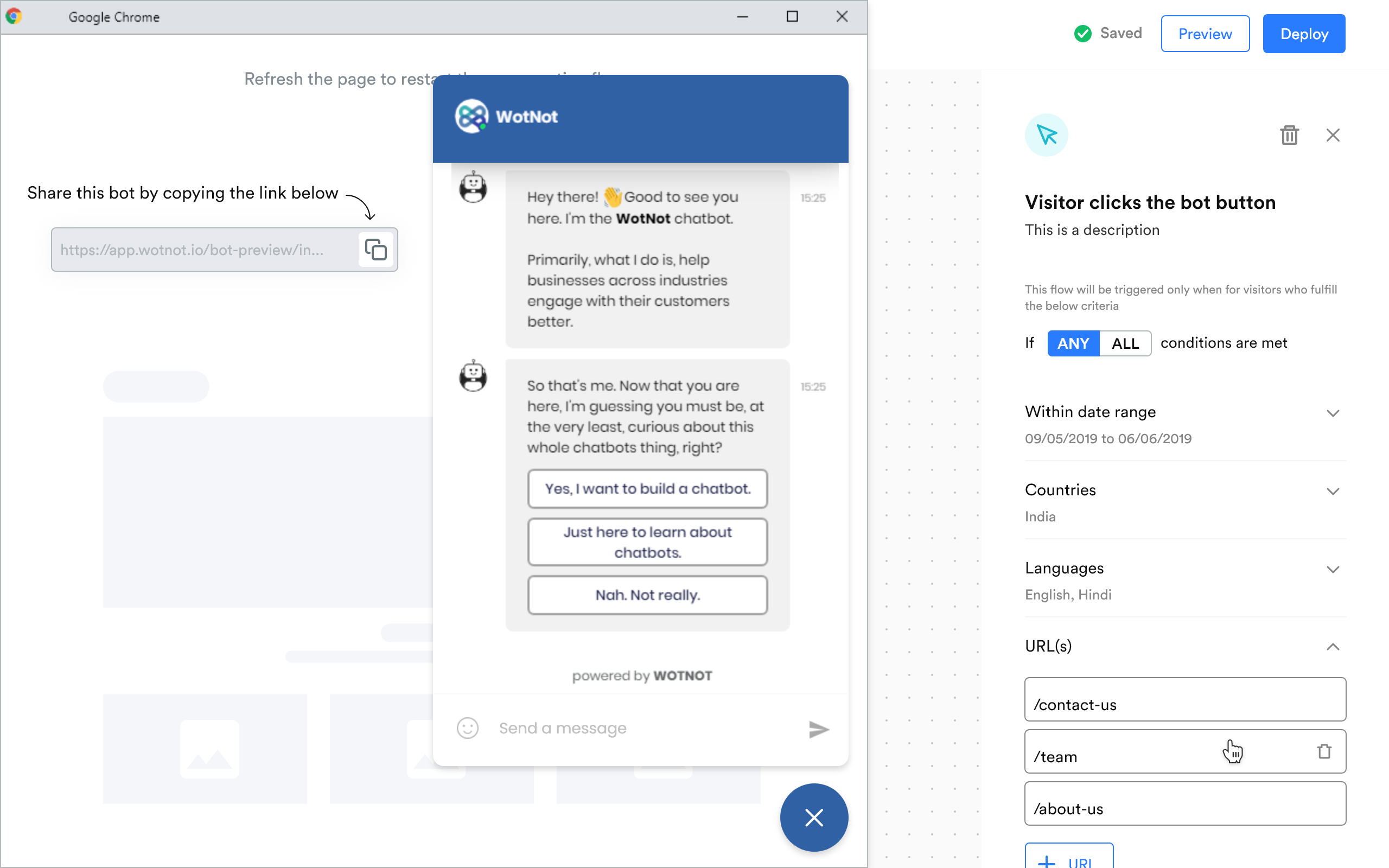 WotNot automates your customer interactions at scale with chatbots. Solve business challenges like getting more leads, booking more appointments, scaling your customer support with cutting-edge chatbots. Customers use WotNot to provide a personalized customer experience to their current or future customers which is available 24/7, responds instantly, totally reliable, and speaks the customer language. Add a chatbot to any vertical like Real Estate, Insurance, Finance, Healthcare, Automotive, SaaS, Banking, Consumer Goods, Manufacturing, and Education to cater to multiple use-cases. With WotNot's No-code Bot Builder, you can build bots fairly easily with an intuitive visual builder. Manage multiple bots for different activities based on the triggers and conditions defined by you. Also, WotNot offers a done-for-you service wherein our team of experienced conversation design experts understand your needs and carefully create a conversation flow that matches the needs of your business and keep optimizing the flow by reviewing the results.
