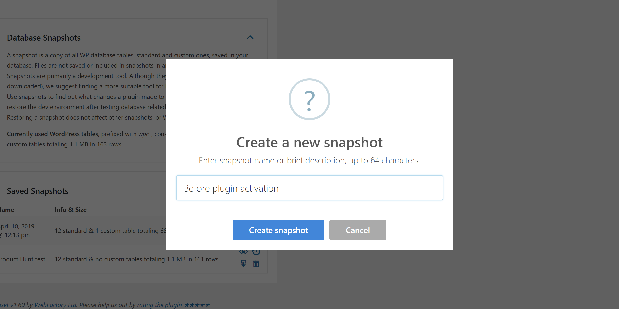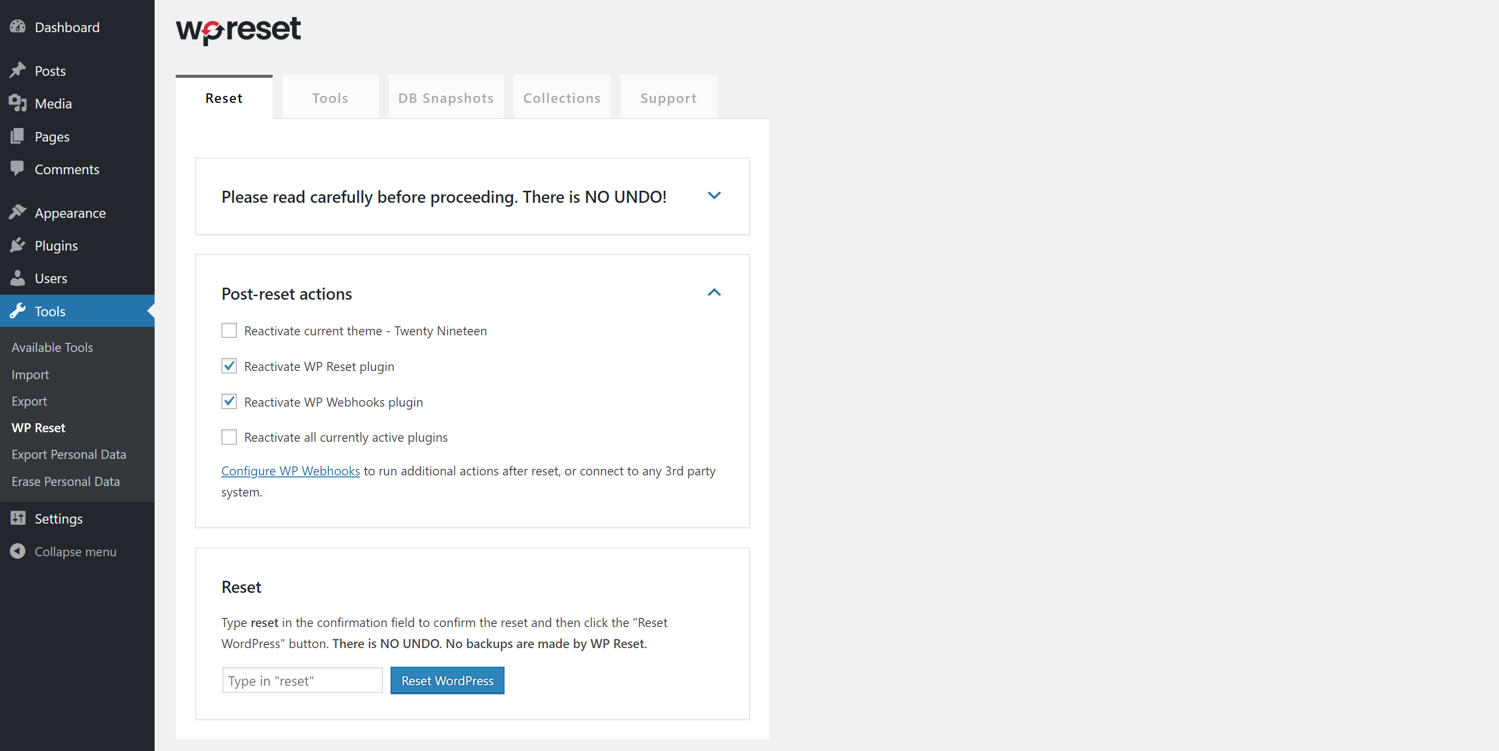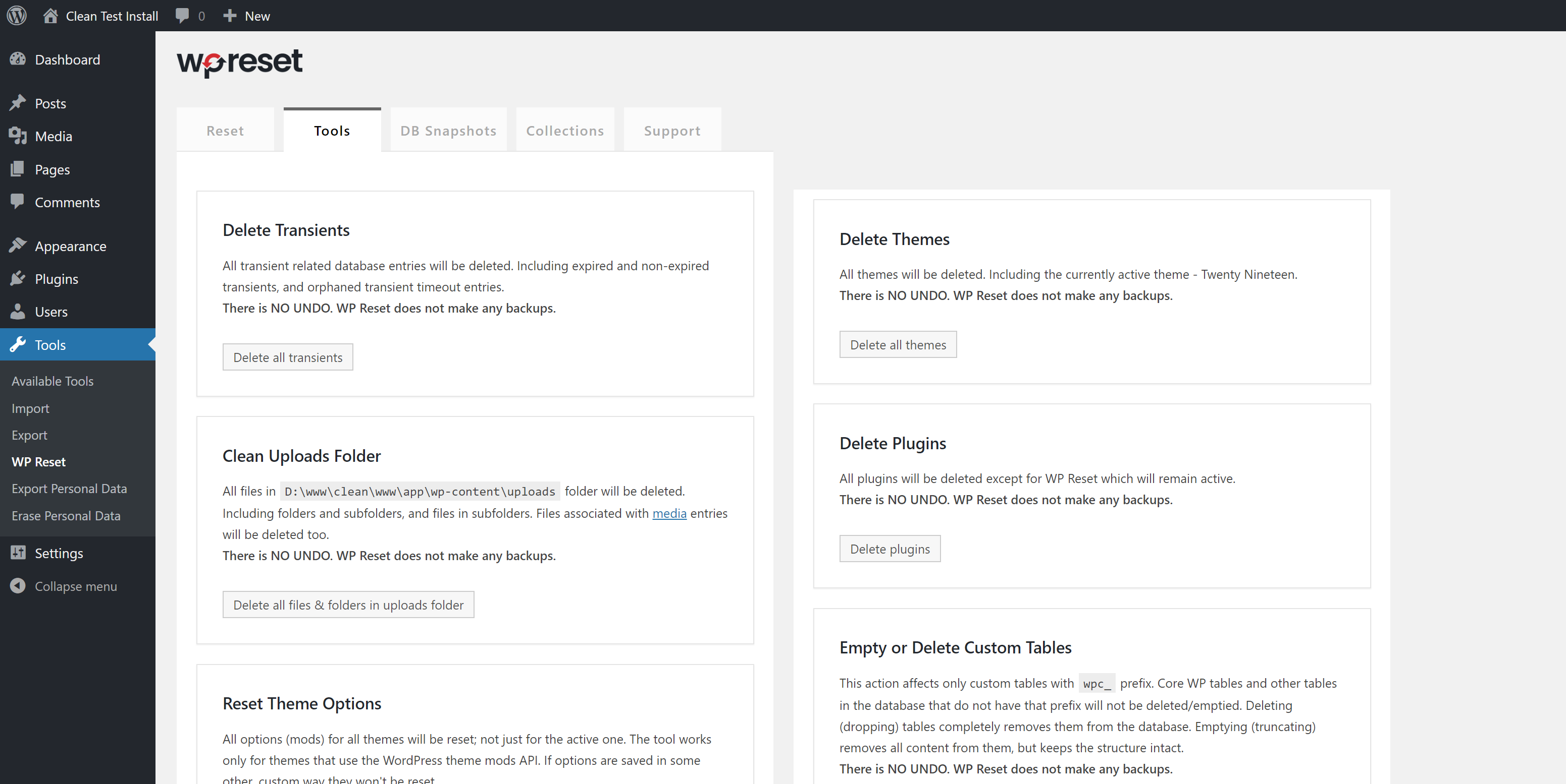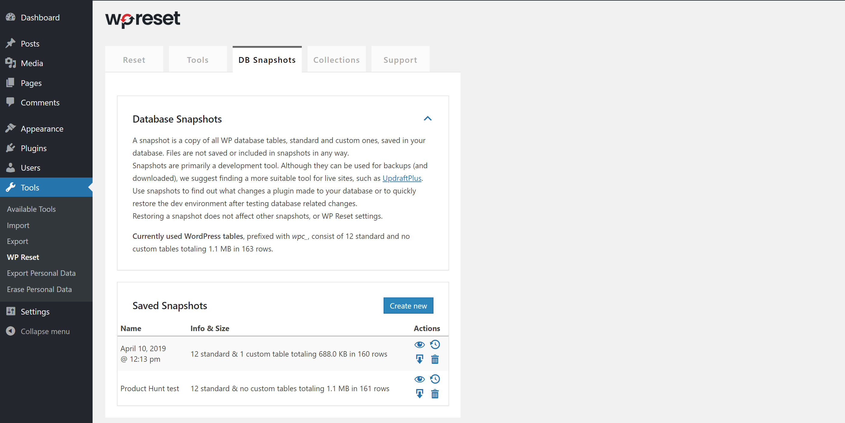 You've started building a WP site, tried out a few themes & plugins and things got messy. The database is filled with garbage and you need to start fresh! How do you do it? You use WP Reset and reset the installation in one click! Debugging & testing WordPress is hard and frustrating. It can take hours to fix even the simplest bug. Make your life easier with the right WordPress tools that'll help you fix any WP problem. WP Reset is the only free development tool created for non-dev users who just want things done! Join over 150,000 users who save time with WP Reset! Check out the site for a full list of features!