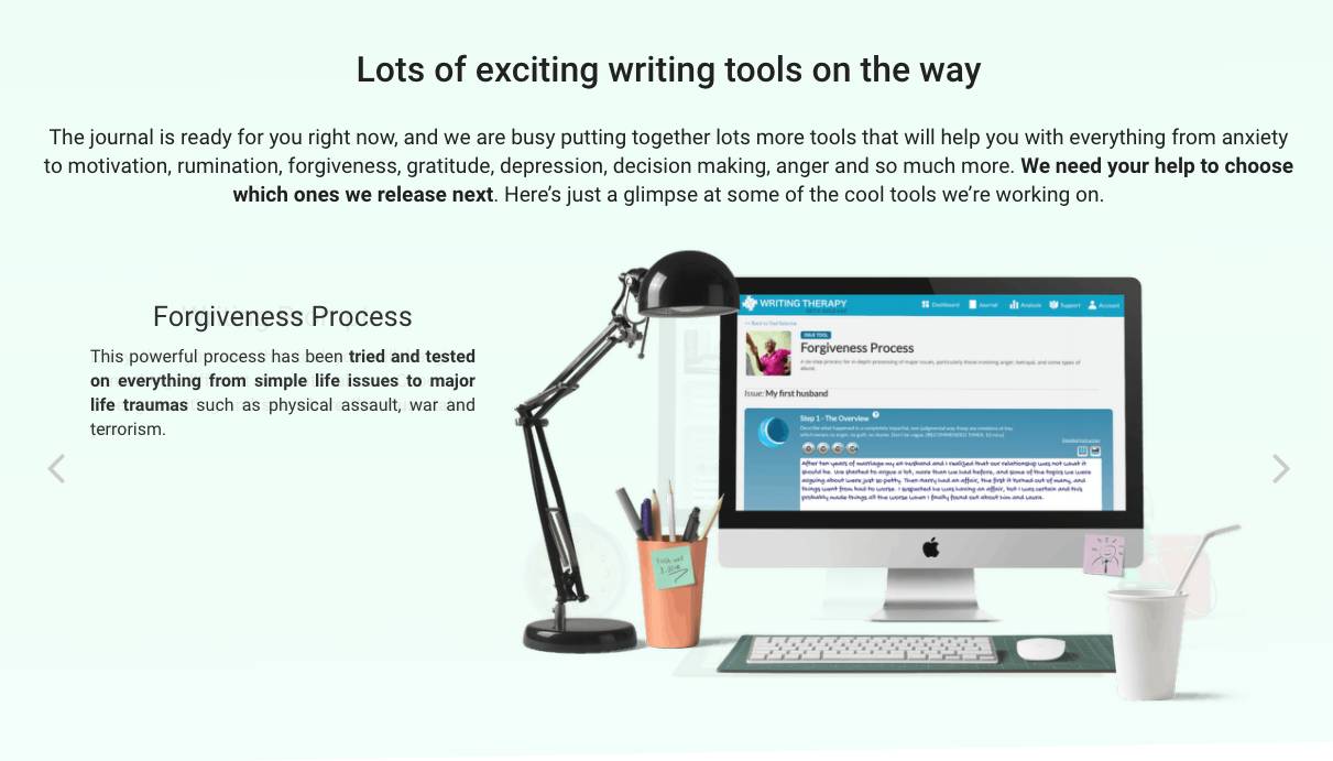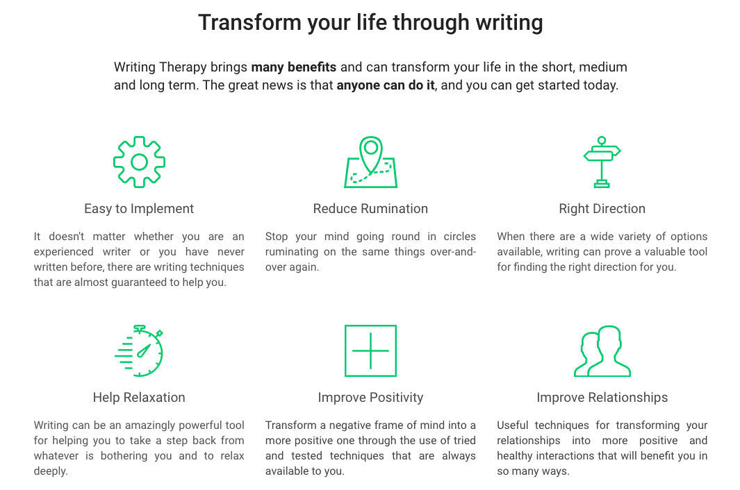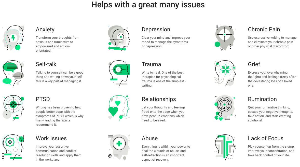 Online tool that anyone can use to help with anxiety, depression, chronic pain, grief, relationship issues, work problems, procrastination, and so much more. Using this ever expending collection of tried-and-tested writing tools, and exclusive text analysis, helps you to work through any issues in your life, and diminish the impact they have on you. Writing Therapy is a self-help alternative to conventional talk therapies. It is not a replacement, but is a highly-effective option for people who might not feel they are ready for talk therapy, or might not consider their issues are serious enough for medical/psychology interventions.
