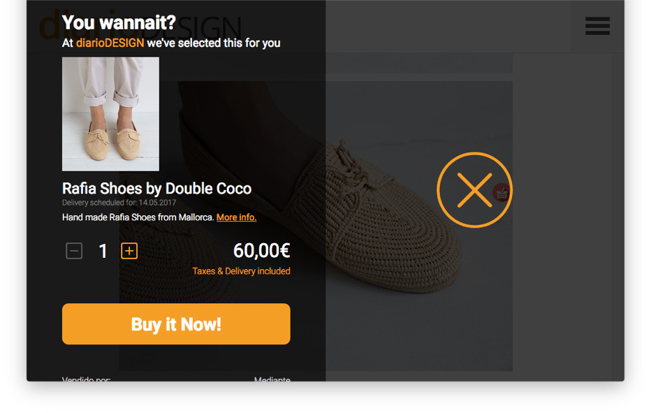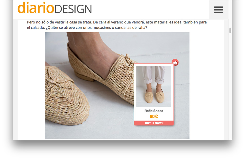 THE PROBLEM The customer's buying journey is long and tedious: People want what they want right now. Brands and e-tailers must to buy traffic to attract their potential buyers. Media need to sell their audiences through advertising to monetize their content. THE SOLUTION We created a SaaS tech that allows to buy a product in an in-page checkout. Customers: They can buy whatever they discover in the same place where they discovered it. Brands: they get a sell and a new customer. Publishers: they get revenue from content. TARGET GROUP Is a B2B2C: Brands and e-tailers, who add their catalog to have the posibillity to sell in a in-page checkout, on their own channels or gained channels from Publishers. Digital Publications: who are looking for new ways to monetize their content.