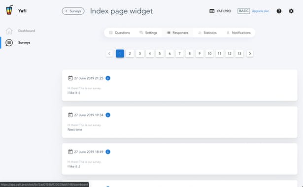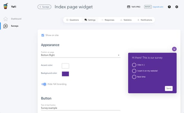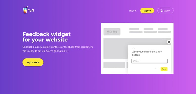 Hi there! I present you Yafi — feedback widget. This is a powerful tool for creating a better user experience for your website. Create any survey you need: add any questions (with a text answer, response options, emoticons, contact information, NPS), show it on certain pages and devices, or after specific users actions, adjust colors of the widget to make it look fit on the site. We just started, but we work hard to make our product better. We'd love to hear your feedback, both the good and the bad. Hope you’ll like it!