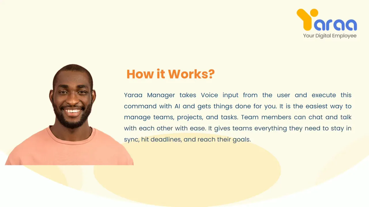 Yaraa Manager is the easiest way to manage Remote teams, Projects, and Tasks. Yaraa is AI powered Business suite that Creates projects & Task Scheduling Without human Interaction. Team members can chat and talk with each other with ease. It gives teams everything they need to stay in sync, hit deadlines, and reach their goals. - Digital Employee improve work efficiency by operating 24/7 - Automate your work processes with Digital Employee - Empower your business for a Hybrid (remote + onsite) Work environment - No English. No Worry. Speak in your language and get work done Speak to Yaraa in Any popular languages & create Project |Task | To Do Manage your projects in one centralized platform without human Interaction. Move team ideas to action, quickly and faster: Collaborate & deliver your project on time by managing and reviewing tasks. Increase Team Conversation: Employee engagement and communication become much faster with the Chat and call tool Advance Features: Speech to Text: Honour your team's time using Speech to Text AI technology for quick work actions. Yaraa understands voice commands in all popular languages. Digital human: Yaraa Harnesses tremendous potential in AI technology to solve staff crunch and automate business processes to the next level. Project Tracker: With few Voice-Commands create and manage projects in a few seconds. Actionable project progress report available on the dashboard. Task Tracker: Assign and complete tasks faster than ever with real-time comments. Task timer helps complete priority tasks and in-time delivery. To-do list: Want Employees to manage tasks on their own? Use a to-do list to track workload. Agile companies will find it easy to work with it. Calendar and Board View: The easiest way for project managers to plan, manage, and visualize their work in a shared team calendar. Organize work on a Kanban board and streamline task management at every stage. Call and Chat: Access important messages easily and organize the conversation by putting them in the right place. Increase Employee Engagement with Task Related group chats, work calls, video calls, Voice Messages, etc. Notification: Get an instant Notification of all activities like Assigned tasks, messages, and new teammates. Set reminders and get notified when important tasks are approaching their due dates.