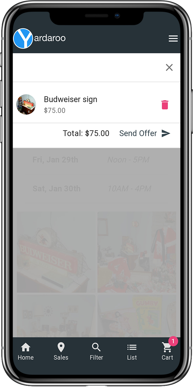 Yardaroo is the comprehensive marketplace solution for on-site sales like garage, estate, consignment, farmer’s markets, flea markets, conventions and pop-up sales. Our innovative offer system allows buyers to make offers on multiple items within a single picture, enabling sellers who have large lots of items to quickly upload pictures and take offers without the need to itemize individual product listings. The benefit to this type of marketplace is obvious for on-site sales where there are lots of random items and high turnover. Any type of liquidation sale can leverage our marketplace to move inventory online quickly. Yardaroo offers an integrated and intuitive point of sale system that is accessible to anyone, from the hobbyist garage saler to professional sellers and small businesses. Yardaroo Pay is a QR code-based POS system that works on any smart device, only takes minutes to set up and enables sellers to accept all major credit cards on-site. If a buyer can’t be on-site, sellers can easily collect credit card payments remotely by sending a payment request via text, messenger app or email. Most sales have multiple people working it, whether they are family members, friends or employees. Yardaroo’s Cashier Mode enables sellers to allow other people to accept credit card payments under their account, streamlining the checkout process. Cashier’s don’t even need the app to be installed on their smart device. Yardaroo increases trust and integrity through community engagement. Buyers and sellers can stay in touch with each other via our integrated social media platform. People can follow each other and engage with each other’s activity. Our internal messaging system offers a convenient way to communicate and ask questions about sales. Having trouble? Contact us 24/7 using our simple online support form. Find answers to common questions using our 24/7 help center.