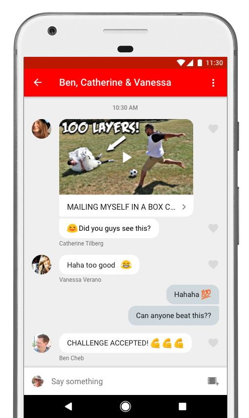You can now share videos with your friends and family directly on YouTube. Not only can you share and receive videos in the app, you can also chat about them right on YouTube, reply with another video, invite others to the conversation, and more. We think it’ll make sharing easier, faster and more fun on your phone. And if you want to continue sharing videos through other apps, you can still do that too.
