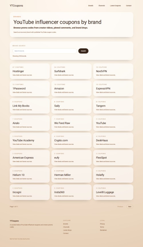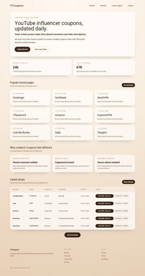 YTCoupons is a coupon discovery platform focused on creator-shared deals from YouTube. It verifies and organizes codes by source context, tracks brands and channels, and helps users find recently shared discounts faster than manual video browsing.
