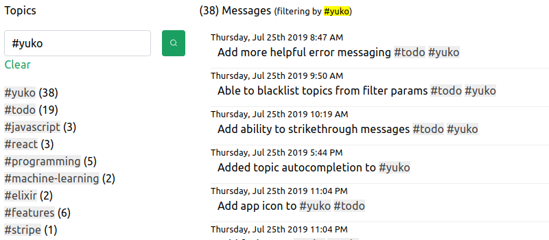 Yuko is a lightweight chat-based bookmarking tool for simple folks. For only a small payment of $15/year, you can bookmark and categorize any text content in a simple chat-based UI. Perfect for getting your thoughts out on paper for later revision or categorization. Centered around the concept of a "personal" chat-room, messages can be tagged with #topics for later retrieval. All your data is private by default, with no 3rd party scripts/cookies loaded when you're logged in. You're always ensured access to your data through our export process or our simple API.